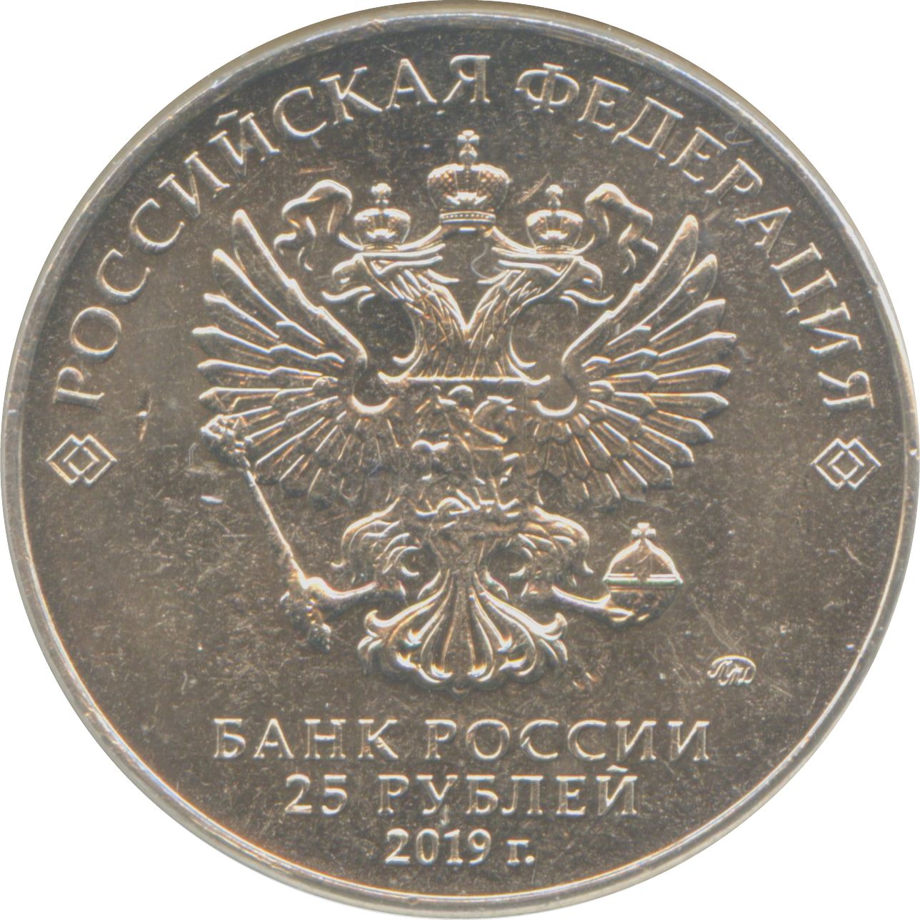 Описание: На аверсі монет зображено рельєфний герб Російської Федерації, над ним по верхньому колу напис «РОССИЙСКАЯ ФЕДЕРАЦИЯ» (РОСІЙСЬКА ФЕДЕРАЦІЯ), обрамлений з обох боків парними ромбами, праворуч — знак Московського монетного двору, а в центрі монет під гербом — трирядковий напис «БАНК РОССИИ» (БАНК РОСІЇ), номінал монети «25 РУБЛЕЙ» (25 РУБЛІВ), рік випуску «2019 г.» (2019).