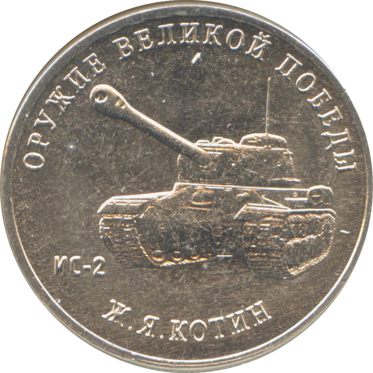 Описание: Рельєфне зображення важкого танка ІС-2 та напис «ИС-2» (IS-2) зліва; по колу зверху розміщений напис «ОРУЖИЕ ВЕЛИКОЙ ПОБЕДЫ» (ЗБРОЯ ВЕЛИКОЇ ПЕРЕМОГИ), а знизу — «Ж.Я. КОТИН» (ЙОСИФ КОТІН).