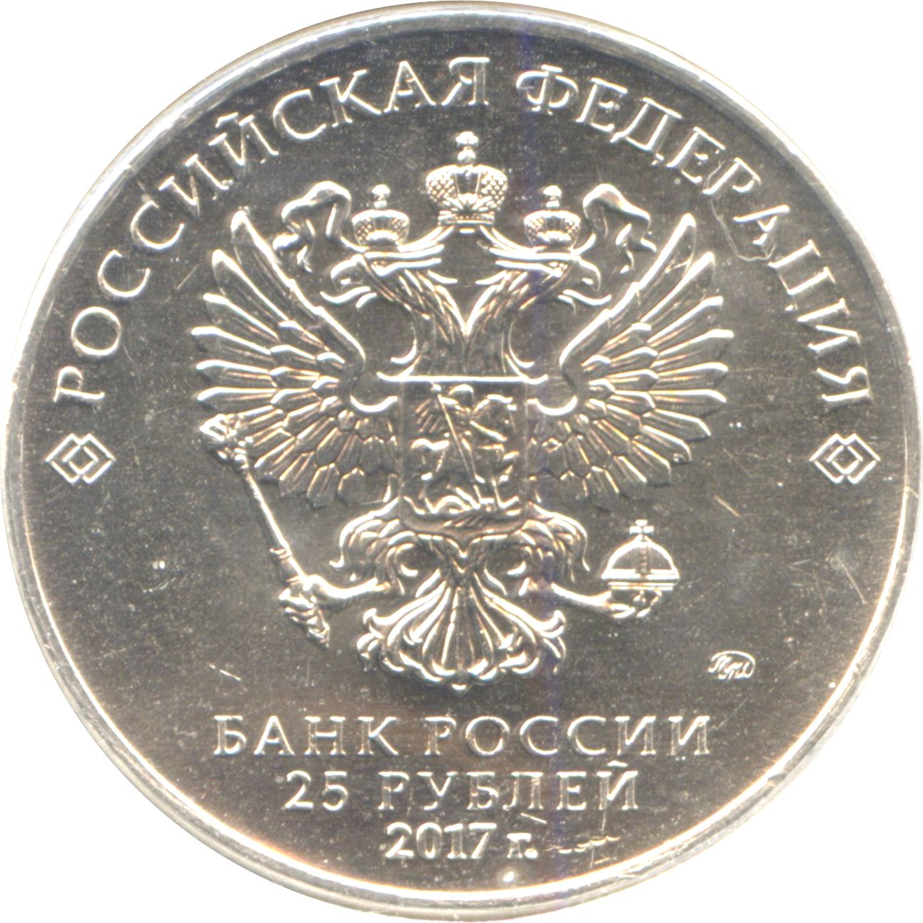 Описание: На аверсі монети зображено рельєфний герб Російської Федерації та напівкруглий напис по краю: «РОССИЙСКАЯ ФЕДЕРАЦИЯ» («РОСІЙСЬКА ФЕДЕРАЦІЯ»), обрамлений парними ромбами з обох боків, праворуч — знак монетного двору, внизу — трирядковий напис під гербом «БАНК РОССИИ» , номінал монети «25 РУБЛЕЙ», а також рік випуску «2017».