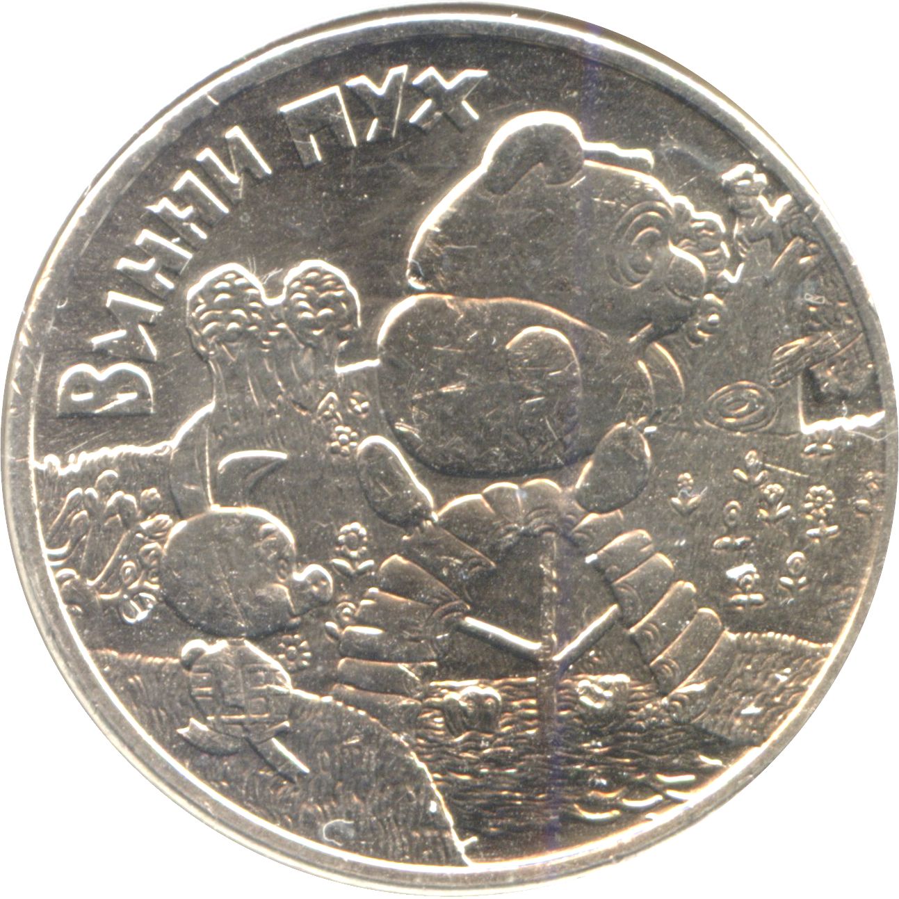 Описание: На монеті з неблагородного металу «Вінні-Пух» зображено рельєфне зображення сцени з мультфільму з Вінні-Пухом і П'ятачком. По периметру зверху розміщено напис «ВИННИ ПУХ» («ВІННІ-ПУХ»).