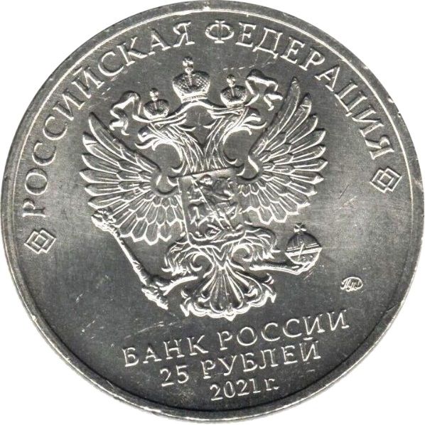 Описание: У центрі розміщено рельєфне зображення Державного герба Російської Федерації, а над ним — напівкруглий напис уздовж краю «РОССИЙСКАЯ ФЕДЕРАЦИЯ» (РОСІЙСЬКА ФЕДЕРАЦІЯ), обрамлений подвійними ромбами з обох боків, під емблемою, у три рядки, розміщено напис «БАНК РОССИИ» (БАНК РОСІЇ), номінал монети «25 РУБЛЕЙ» (25 РУБЛІВ) і рік випуску «2021 г.» (2021), а праворуч — знак монетного двору.