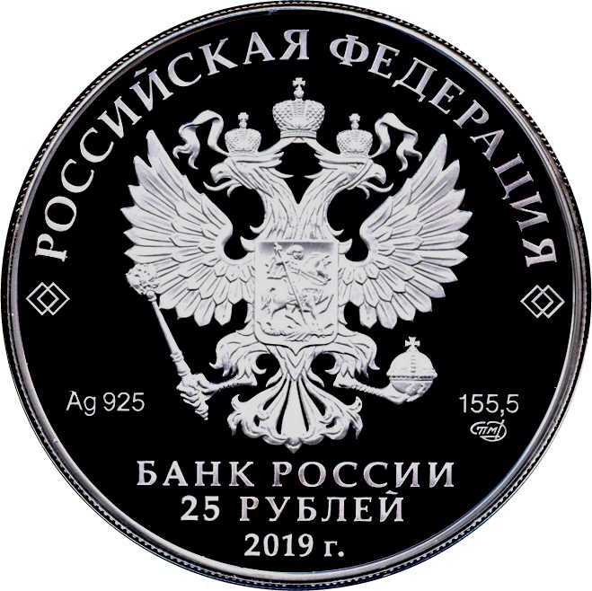 Описание: На аверсі монети зображено рельєфний герб Російської Федерації. Є написи: «РОССИЙСКАЯ ФЕДЕРАЦИЯ» (РОСІЙСЬКА ФЕДЕРАЦІЯ), «БАНК РОССИИ» (БАНК РОСІЇ), номінал монети — «25 РУБЛЕЙ» (25 РУБЛІВ) і рік — «2019», позначення металу відповідно до періодичної системи елементів Д. І. Менделєєва, проба, торгова марка Московського монетного двору та вміст дорогоцінного металу.