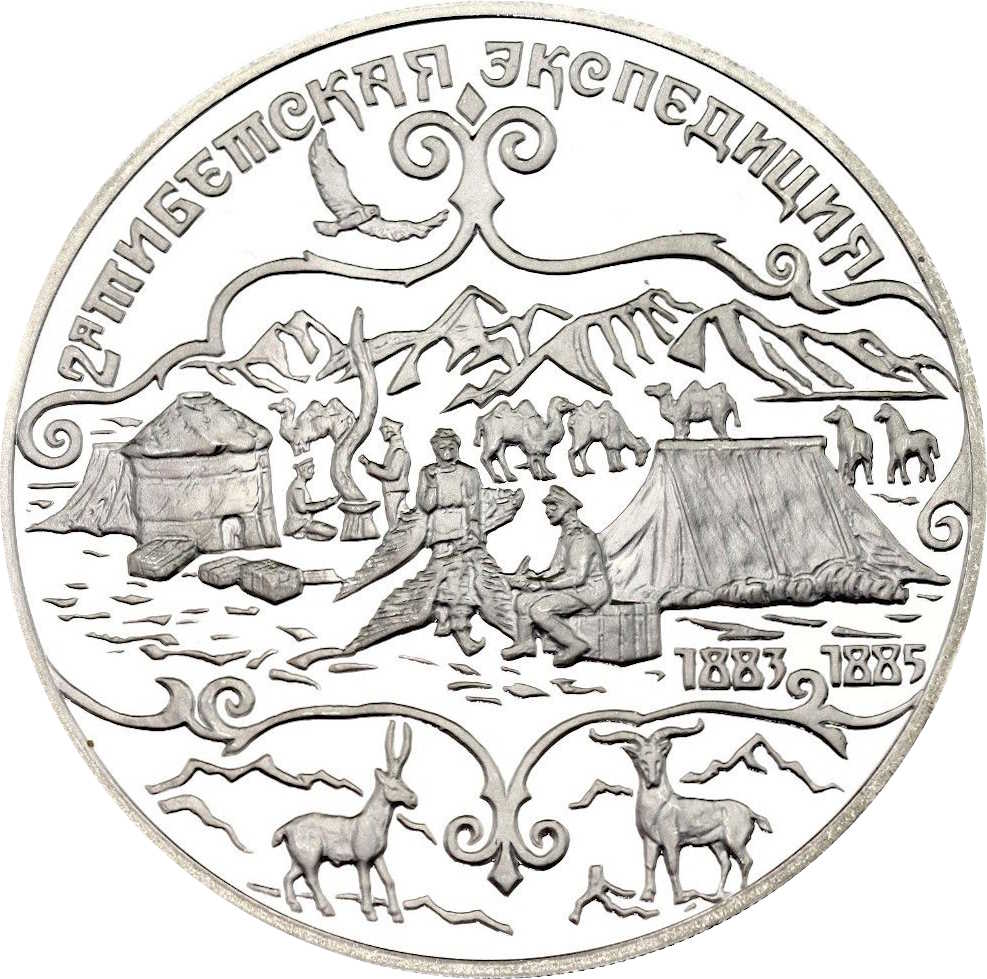 Описание: Зображення табору експедиції на тлі гір, праворуч — дати «1883» «1885», вгорі — птах у польоті, внизу ліворуч — антилопа, праворуч — куку-яма (вид родини кавікорнів, що має ознаки козла та барана). Напис у верхній частині вздовж краю: «2-я ТИБЕТСКАЯ ЭКСПЕДИЦИЯ» (2-га ТИБЕТСЬКА ЕКСПЕДИЦІЯ).