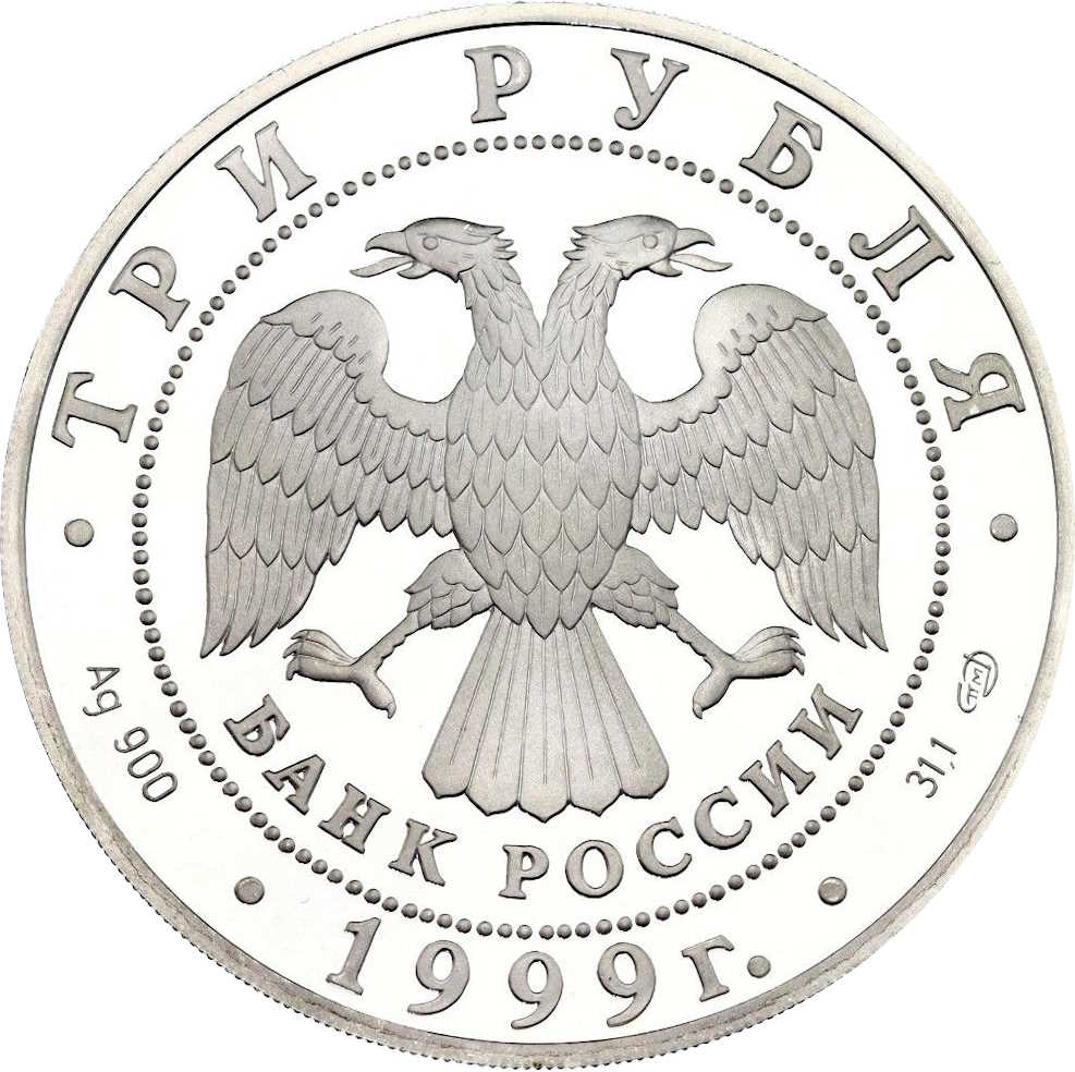 Описание: У центрі — емблема Банку Росії (двоголовий орел, розроблений І. Білібіним), нижче — напівкруглий напис — «БАНК РОССИИ» (БАНК РОСІЇ), обрамлена колом з крапок і написів по краю: вгорі — «ТРИ РУБЛЯ» (ТРИ РУБЛІ), внизу — «1999», літери ліворуч позначають метал і пробу, праворуч — вміст дорогоцінного металу і знак монетного двору.