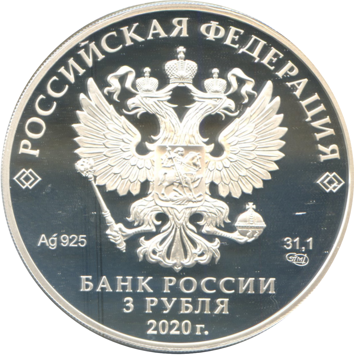 Описание: Рельєфне зображення державного герба Російської Федерації та написи: «РОССИЙСКАЯ ФЕДЕРАЦИЯ» (Російська Федерація), «БАНК РОССИИ» (Банк Росії), номінал монети «3 РУБЛЯ» (3 рублі), рік випуску «2020 г.». (2020), позначення металу відповідно до періодичної системи елементів Д.І. Менделєєва, проба, торгова марка монетного двору Санкт-Петербурга та вміст дорогоцінного металу.