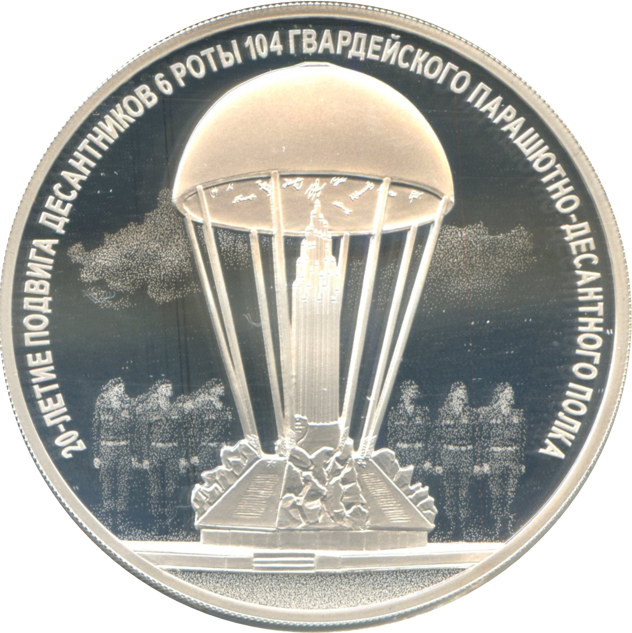 Описание: Рельєфне зображення пам'ятника 6-й роті («Купол»), встановленого в селі Череха Псковської області, на тлі формування десантників, обробленого лазером для матового покриття; по колу є напис: «20-ЛЕТИЕ ПОДВИГА ДЕСАНТНИКОВ 6 РОТЫ 104 ГВАРДЕЙСКОГО ПАРАШЮТНО-ДЕСАНТНОГО ПОЛКА» («20-та річниця героїчного подвигу 6-ї роти 104-го гвардійського парашутно-десантного полку»).