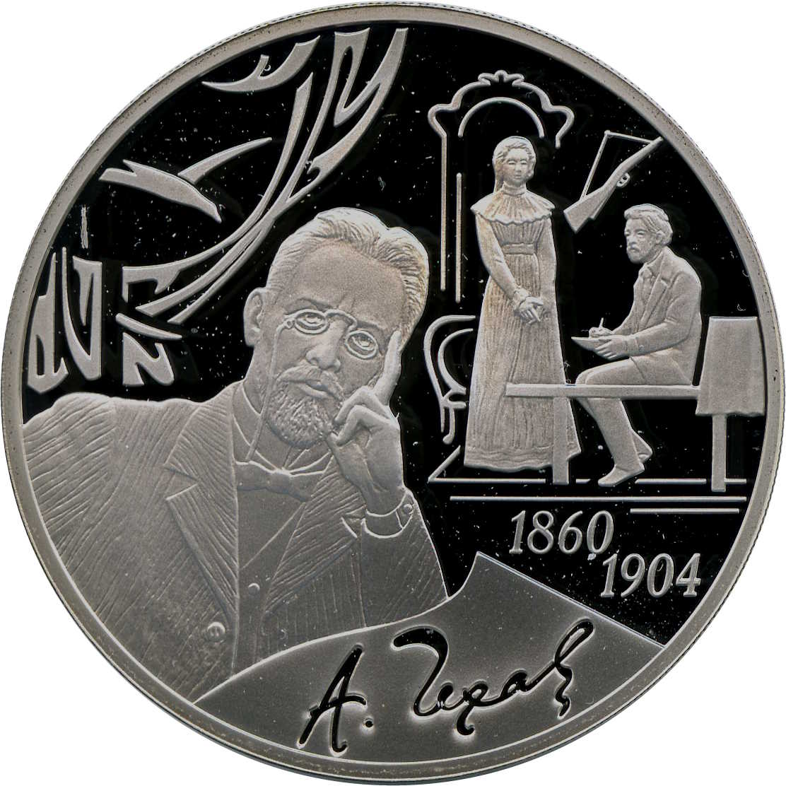 Описание: Зліва — портрет А. П. Чехова, над ним — крапля з стилізованим зображенням чайки, праворуч у інтер'єрі кімнати — зображення стоячої дівчини та сидячого чоловіка, за ними на стіні — рушниця, нижче — дати у двох рядках: «1860» і «1904», нижче на матовому полі аркуша паперу — факсимільний підпис письменника: «А. ЧЕХОВ» (A.CHEKHOV).