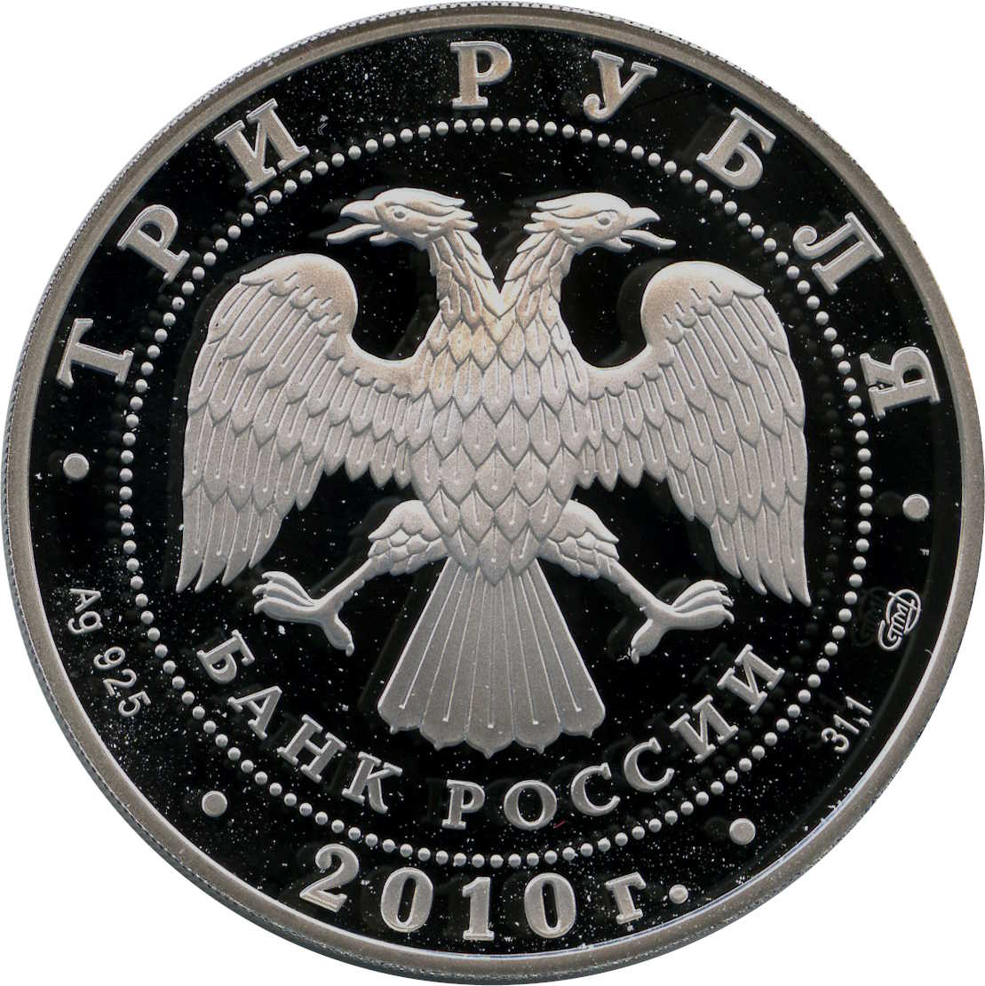 Описание: У центрі — емблема Банку Росії [двоголовий орел із розпростертими крилами, під ним — напівкруглий напис «БАНК РОССИИ» (БАНК РОСІЇ)], обрамлена колом з крапок і написів по краю — зверху: «ТРИ РУБЛЯ», нижче: ліворуч - позначення дорогоцінного металу та його проби, у центрі - рік випуску «2010 г.», праворуч - вміст дорогоцінного металу та знак монетного двору.