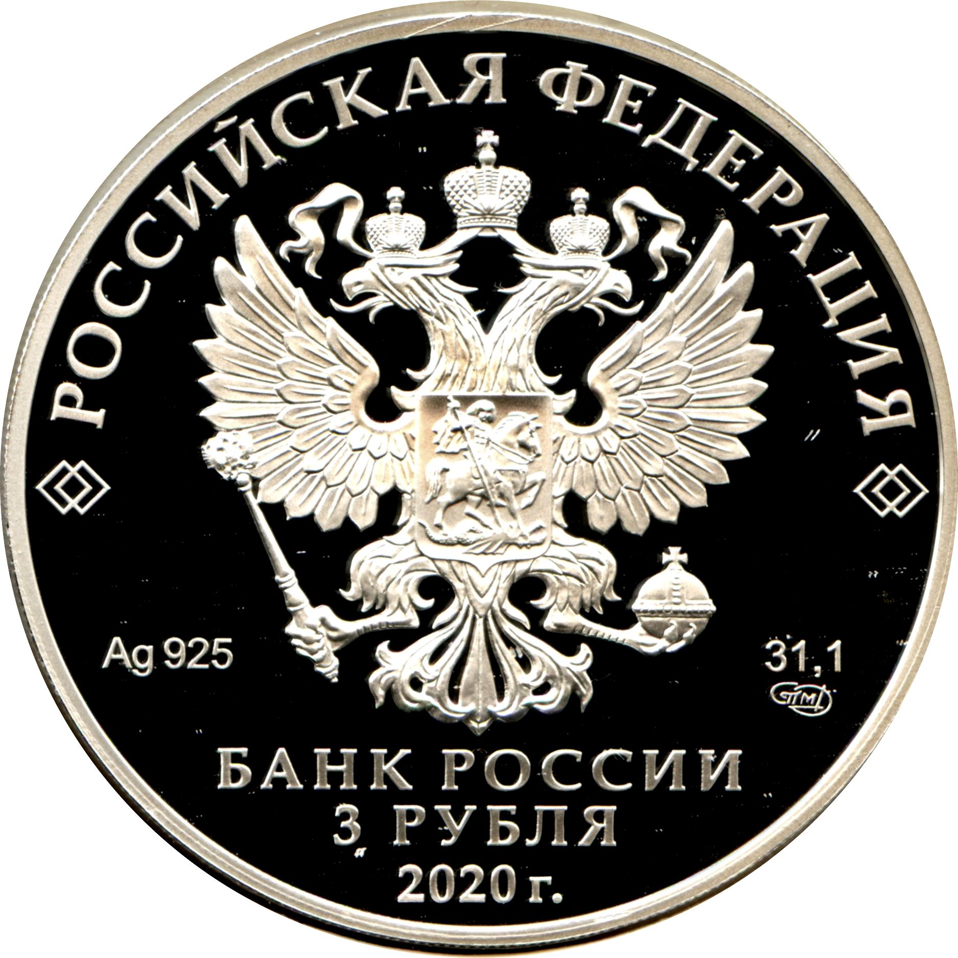 Описание: На дзеркальному полі диска зображено рельєфний герб Російської Федерації, над ним по колу розміщено напівкруглий напис «РОССИЙСКАЯ ФЕДЕРАЦИЯ» (РОСІЙСЬКА ФЕДЕРАЦІЯ), обрамлене з обох боків подвійними ромбами, нижче під гербом зліва вказано дорогоцінний метал і його пробу, а праворуч — вміст дорогоцінного металу і знак монетного двору, внизу по центру трьома рядками розміщено напис «БАНК РОССИИ» (БАНК РОСІЇ), номінал монети «3 РУБЛЯ» (3 РУБЛІ) і рік випуску «2020 г.» (2020).