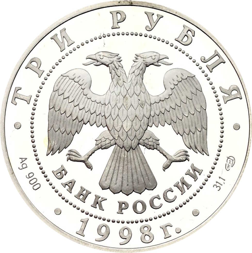 Описание: У центрі — емблема Банку Росії (двоголовий орел, розроблений І. Білібіним), нижче — напівкругла напис — «БАНК РОССИИ» (БАНК РОСІЇ), обрамлена колом з крапок, а по краю — написи: вгорі — «ТРИ РУБЛЯ» (ТРИ РУБЛІ), внизу — «1998», літери ліворуч позначають метал і пробу, праворуч — вміст дорогоцінного металу та знак монетного двору.