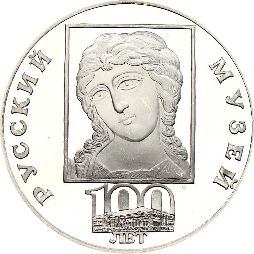 Описание: Фрагмент (голова архангела) з ікони до половини довжини невідомого художника Новгородської художньої школи кінця XII століття. Внизу — Строгановський палац і дата «100 ЛЕТ» (100 РОКІВ), напис по краю: «РУССКИЙ МУЗЕЙ» (РОСІЙСЬКИЙ МУЗЕЙ).