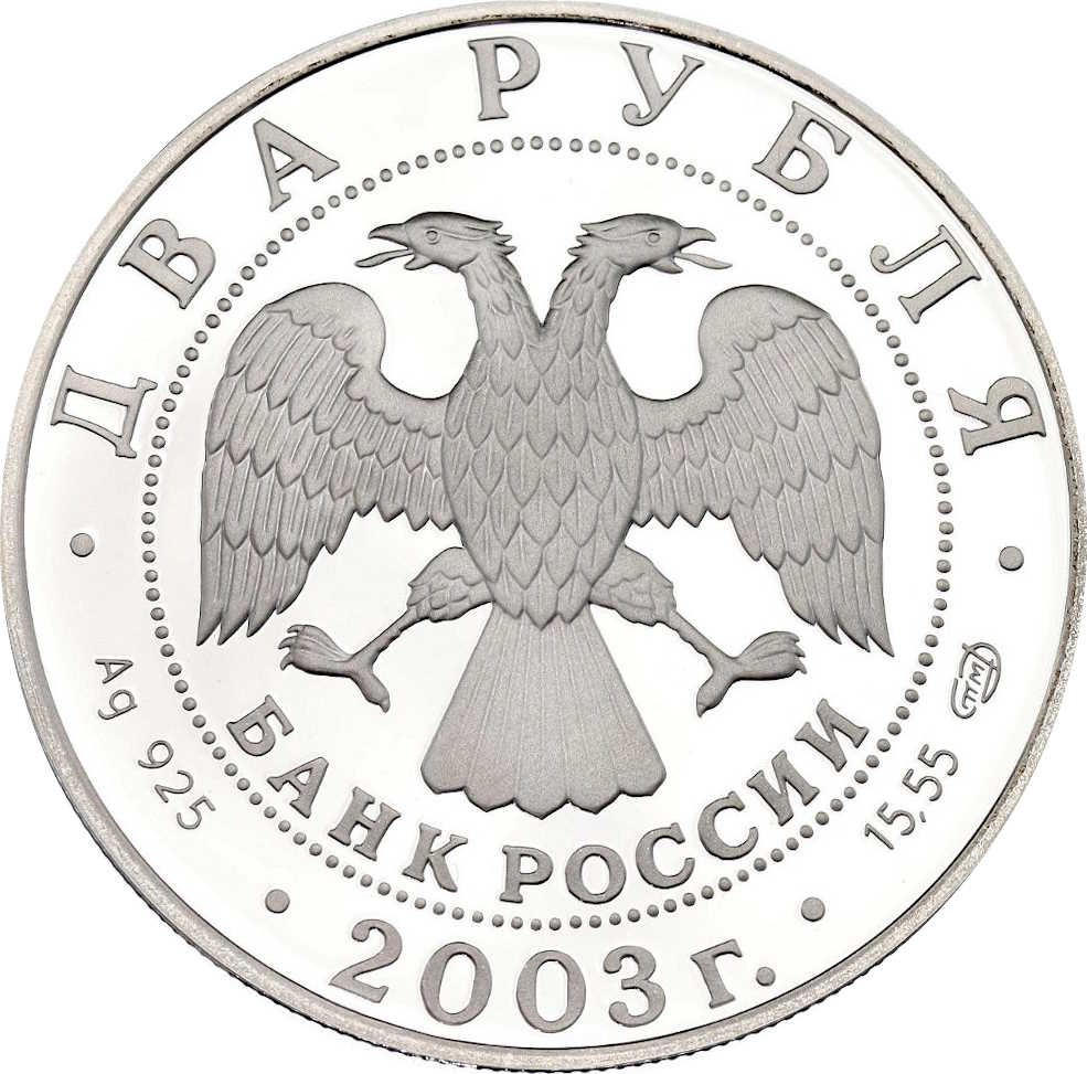 Описание: У центрі — емблема Банку Росії [двоголовий орел із розпростертими крилами, нижче — напівкруглий напис — «БАНК РОССИИ» (БАНК РОСІЇ)], обрамлений колом з крапок і написами по краю: вгорі – «ТРИ РУБЛЯ» (ТРИ РУБЛІ), внизу – рік випуску «2004», літери ліворуч позначають метал і пробу, праворуч – вміст дорогоцінного металу і знак монетного двору.