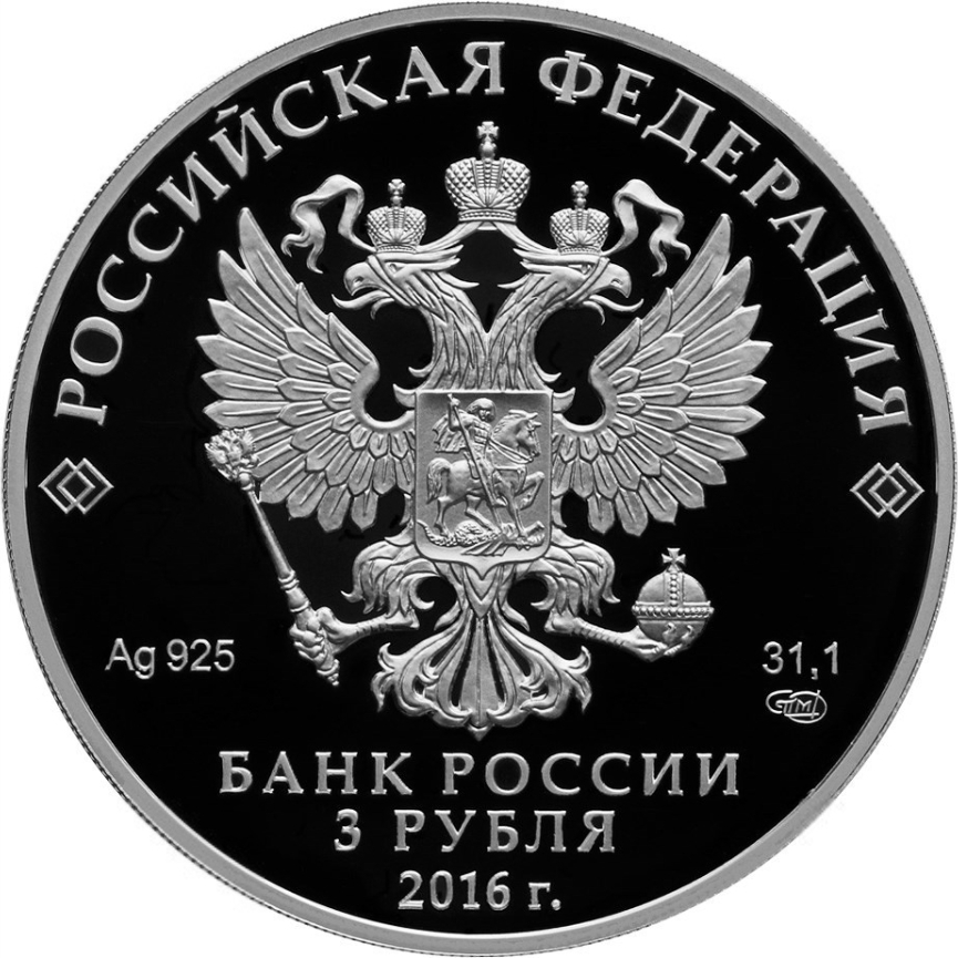 Описание: На дзеркальному полі диска – рельєфне зображення Державного герба Російської Федерації, над ним – напівкруглий напис по колу: «РОССИЙСКАЯ ФЕДЕРАЦИЯ» (РОСІЙСЬКА ФЕДЕРАЦІЯ), обрамлена з обох боків подвійними ромбами, нижче під гербом: ліворуч – позначення дорогоцінного металу та його проби, праворуч – вміст дорогоцінного металу та торговельна марка монетного двору, внизу по центру, у три рядки – напис: «БАНК РОССИИ» (БАНК РОСІЇ), номінал монети: «3 РУБЛЯ» (3 РУБЛІ), рік випуску: «2016 г.» (2016).