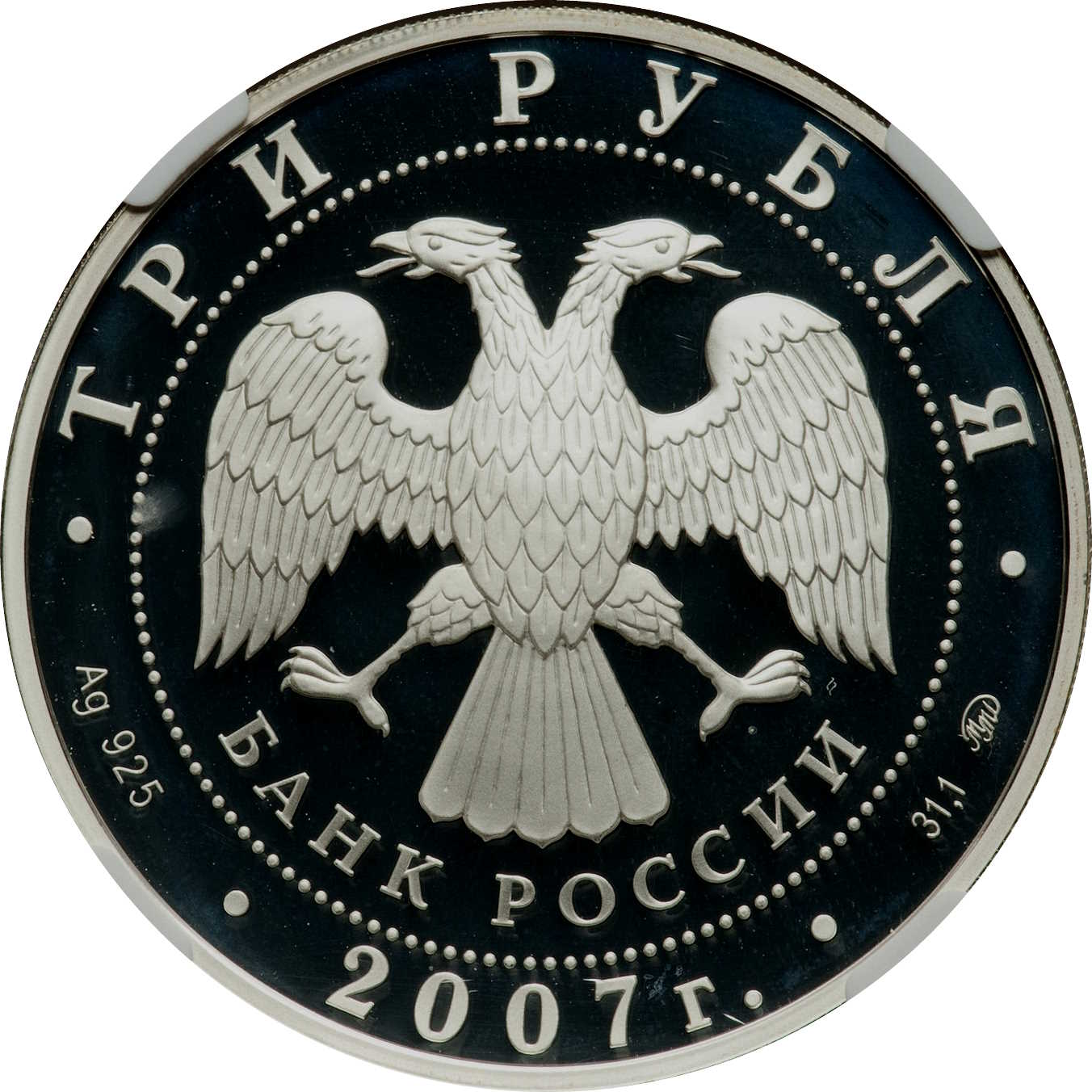 Описание: У центрі — емблема Банку Росії [двоголовий орел із опущеними крилами, під ним — напівкруглий напис «БАНК РОССИИ» (БАНК РОСІЇ)], обрамлена колом з крапок, а по краю — написи: зверху: «ТРИ РУБЛЯ» (ТРИ РУБЛІ), знизу: ліворуч – позначення дорогоцінного металу та його проби, у центрі – рік випуску «2007 г.» (2007), праворуч – вміст дорогоцінного металу та знак монетного двору.