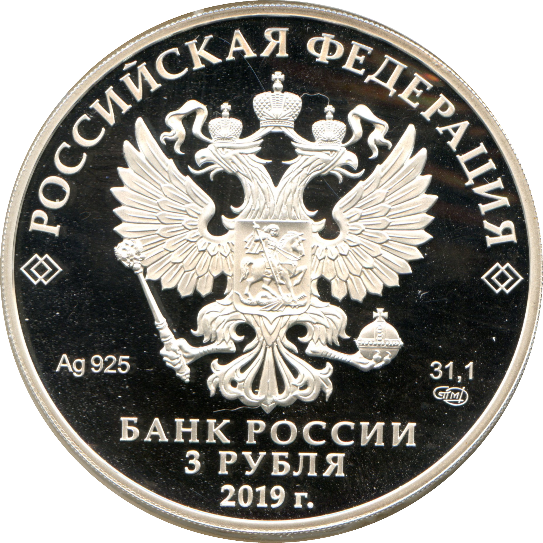 Описание: На дзеркальному полі диска – рельєфне зображення Державного герба Російської Федерації, над ним – напівкругла напис по колу: «РОССИЙСКАЯ ФЕДЕРАЦИЯ» (РОСІЙСЬКА ФЕДЕРАЦІЯ), обрамлений з обох боків подвійними ромбами, нижче під гербом: ліворуч – позначення дорогоцінного металу та його проби, праворуч – вміст дорогоцінного металу та знак монетного двору, внизу по центру, у три рядки – напис: «БАНК РОССИИ» (БАНК РОСІЇ), номінал монети: «3 РУБЛЯ» (3 РУБЛІ), рік.