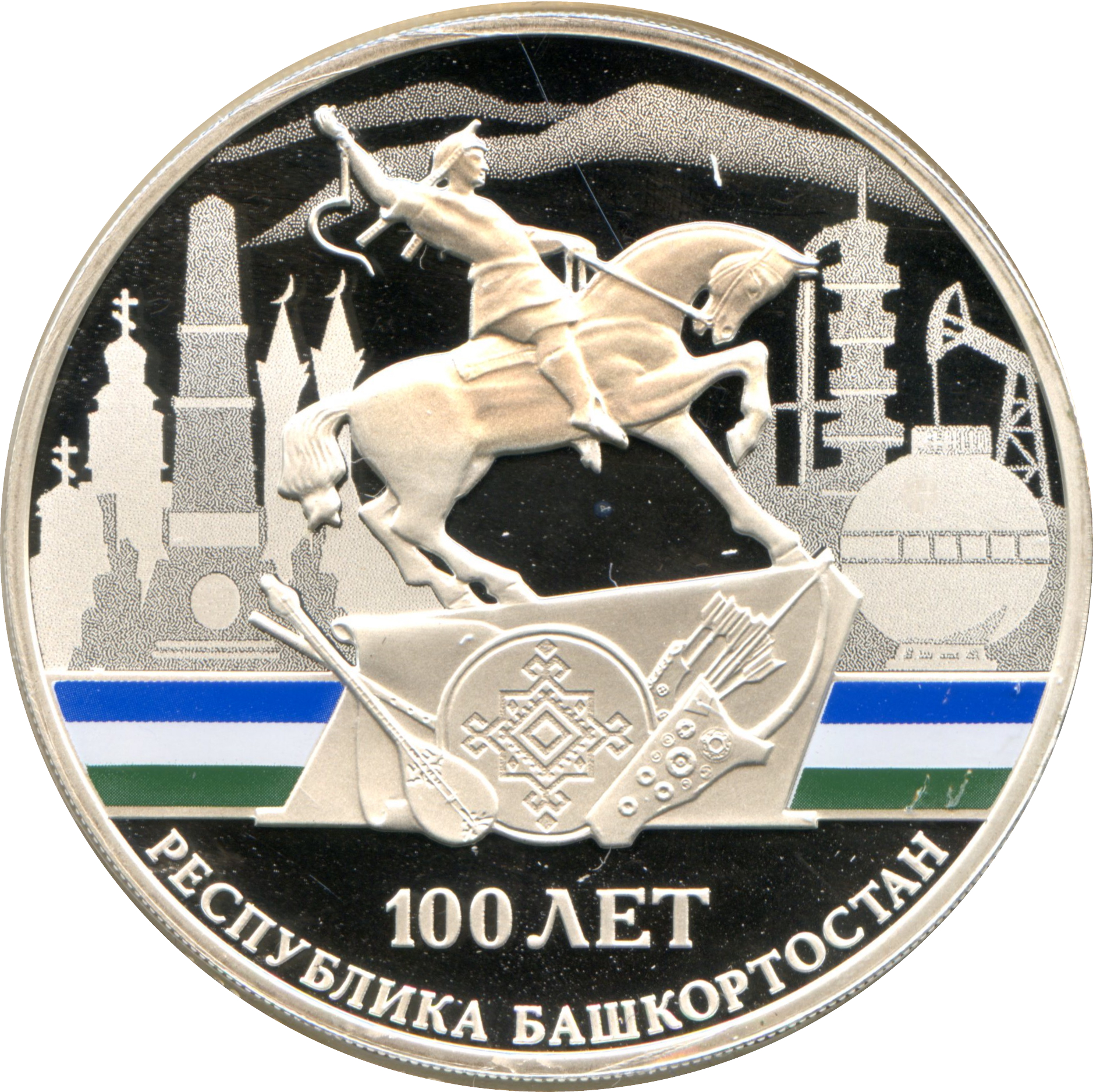 Описание: На тлі смуги, забарвленої у кольори прапора Башкортостану, зображено рельєфні зображення пам'ятника Салавату Юлаєву та предмети, що символізують історичну та культурну автентичність башкирів; на задньому плані — стилізовані композиції предметів, що символізують багатонаціональне населення та розвинену економіку Башкортостану, оброблені лазером для матового покриття; внизу — горизонтальний напис: «100 ЛЕТ» (100 РОКІВ) та напівкруглий напис: «РЕСПУБЛИКА БАШКОРТОСТАН» (РЕСПУБЛІКА БАШКОРТОСТАН).