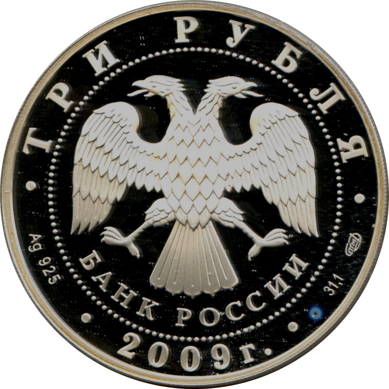 Описание: У центрі — емблема Банку Росії [двоголовий орел із опущеними крилами, під ним — напівкруглий напис «БАНК РОССИИ» (БАНК РОСІЇ)], обрамлена колом з крапок і написів по краю — зверху: «ТРИ РУБЛЯ», нижче: ліворуч - позначення дорогоцінного металу та його проби, в центрі - рік випуску «2009 г.», праворуч - вміст дорогоцінного металу та знак монетного двору.