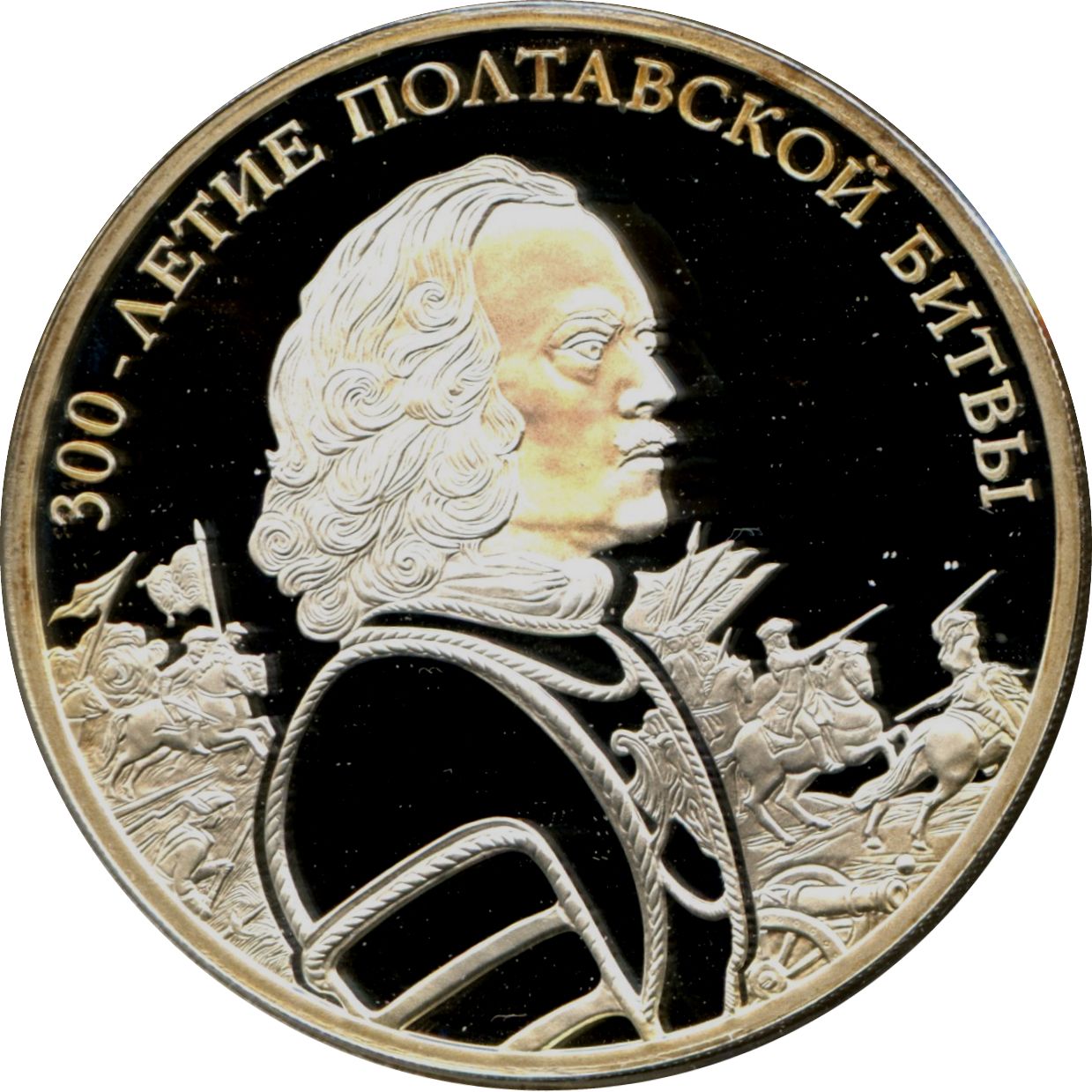 Описание: У центрі — профільний образ Петра I, на тлі — загін воїнів у похідному строї, надпис уздовж обідка: «300-ЛЕТИЕ ПОЛТАВСКОЙ БИТВЫ» (300-РІЧЧЯ ПОЛТАВСЬКОЇ БИТВИ).