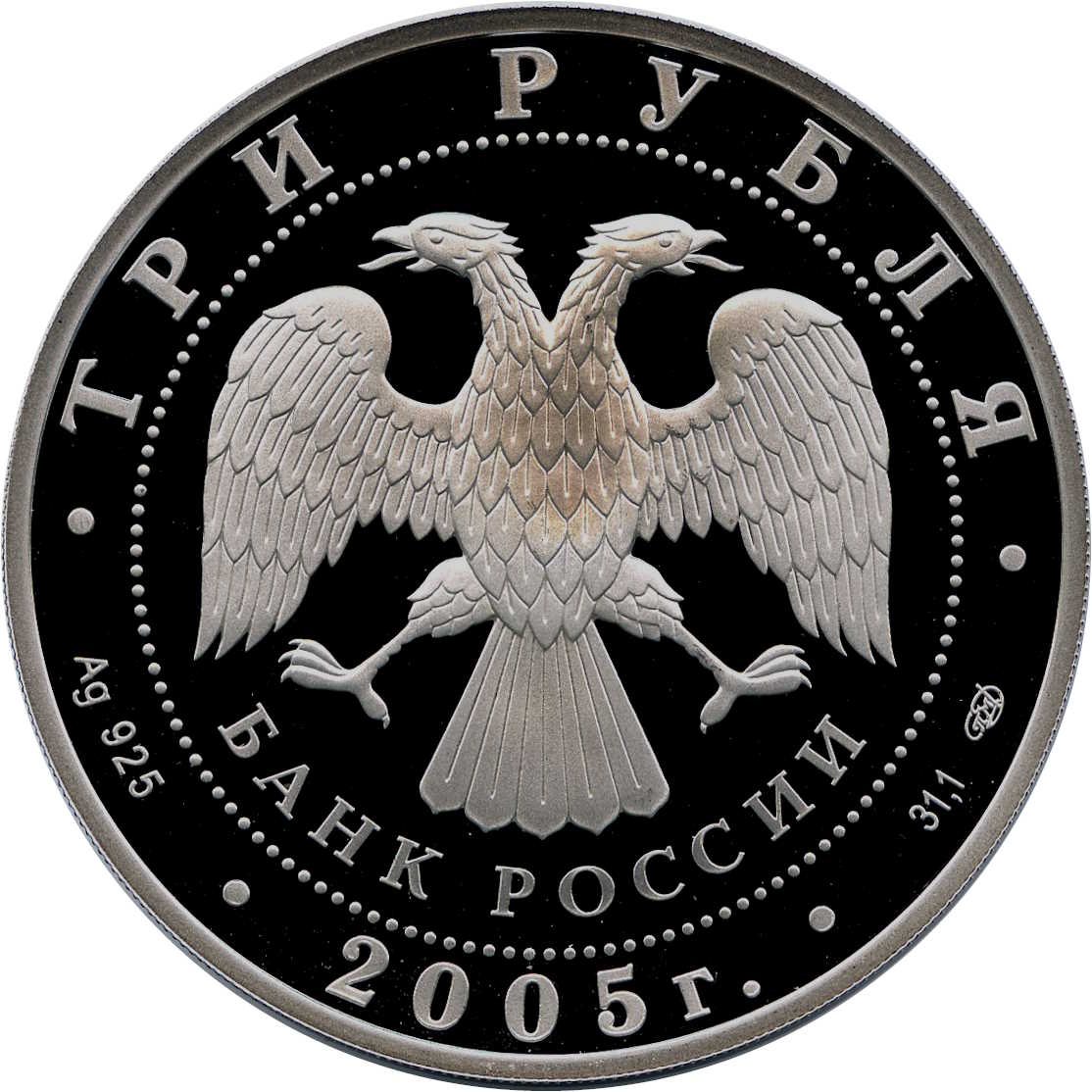 Описание: У центрі — емблема Банку Росії [двоголовий орел із опущеними крилами, нижче — напівкруглий напис — «БАНК РОССИИ» (БАНК РОСІЇ)], обрамлений колом з крапок і написами по краю: вгорі – «ТРИ РУБЛЯ» (ТРИ РУБЛІ), внизу – рік випуску «2005», літери ліворуч позначають метал і пробу, праворуч – вміст дорогоцінного металу і знак монетного двору.