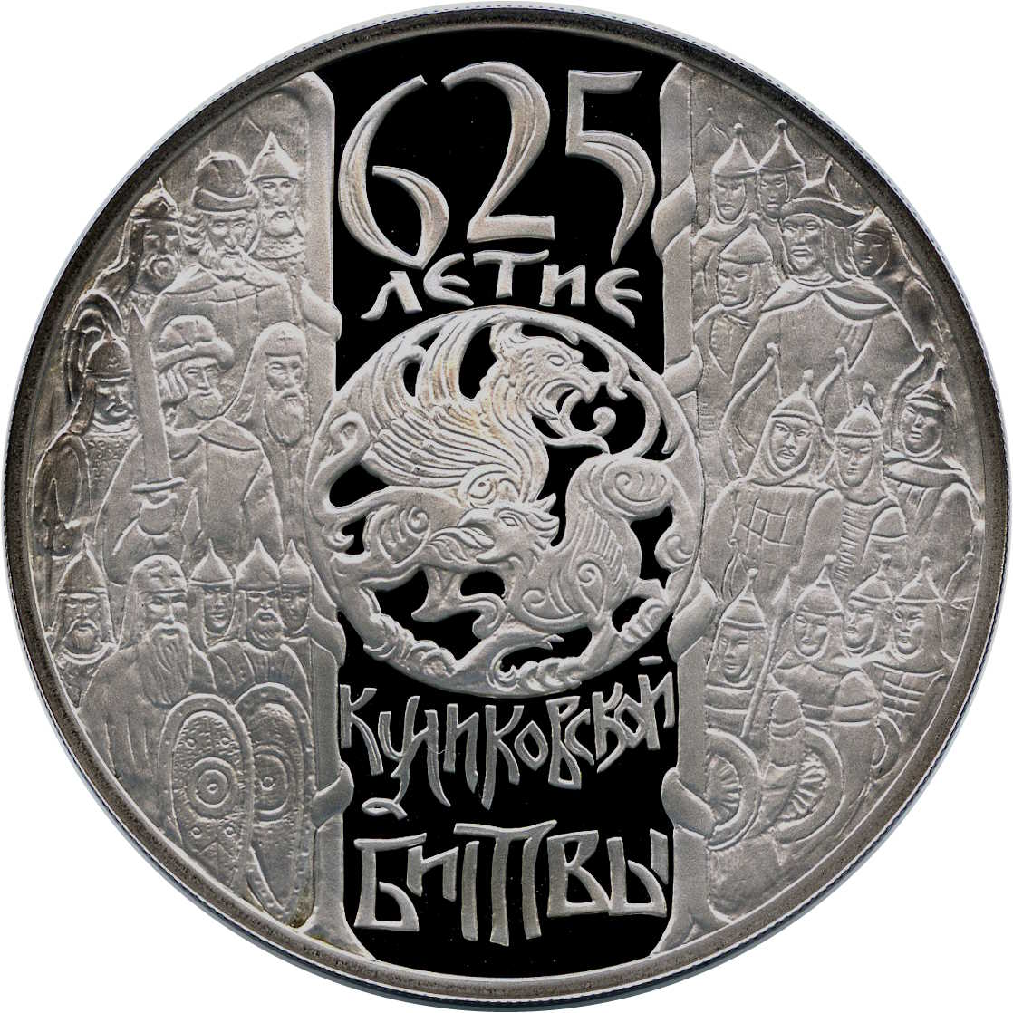 Описание: У колі центральної частини, на вертикальній смузі скляної поверхні – стилізоване зображення крилатого лева та грифона, у верхній та нижній частині смуги – напис у чотири рядки: «625 ЛЕТИЕ КУЛИКОВСКОЙ БИТВЫ» (625-РІЧЧЯ БИТВИ НА КУЛИКОВОМУ ПОЛІ). Ліворуч і праворуч від скляної смуги, на матовій поверхні – зображення російських військ і військ Золотої Орди.