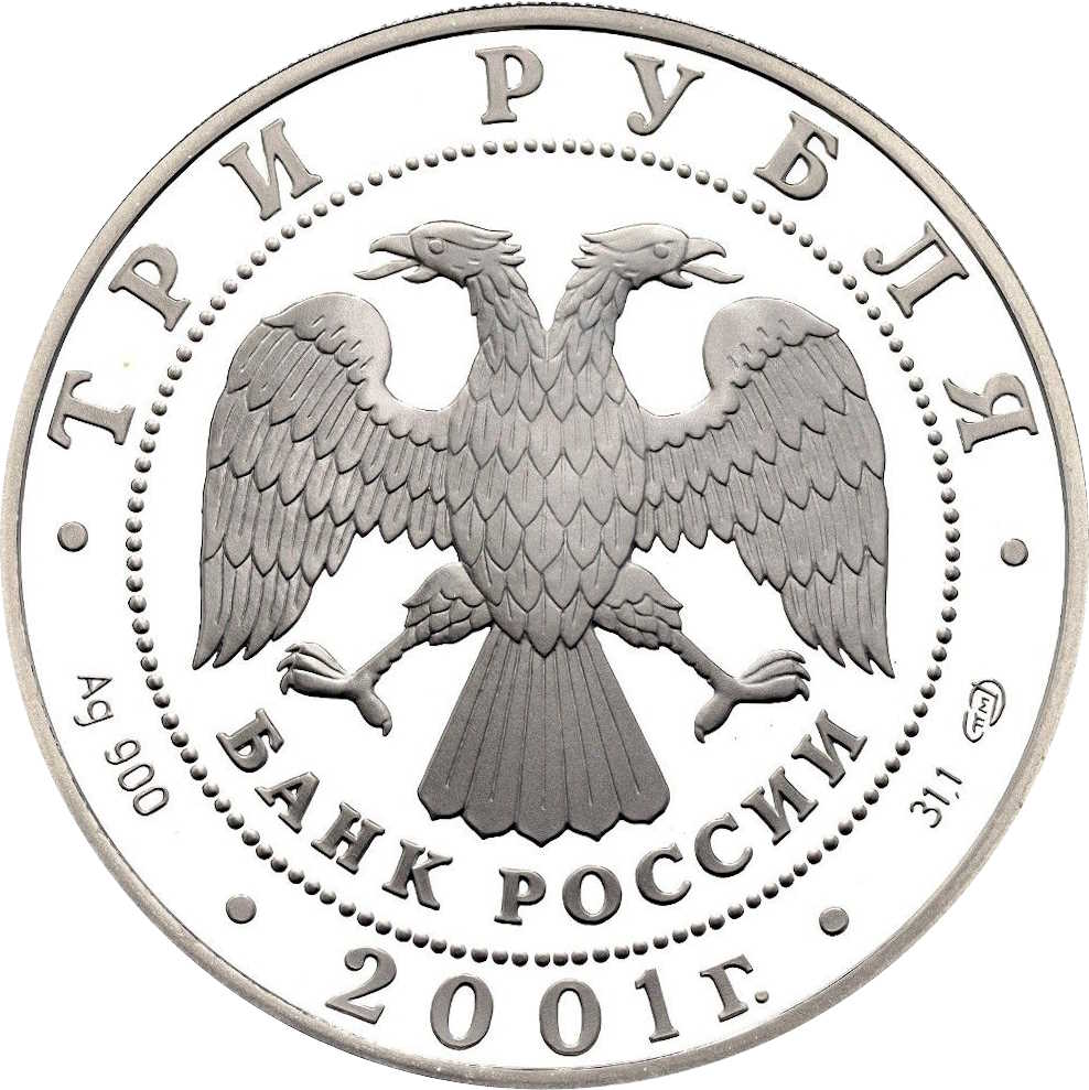 Описание: У центрі — емблема Банку Росії [двоголовий орел зі спущеними крилами, нижче — напівкруглий напис — «БАНК РОССИИ» (БАНК РОСІЇ)], обрамлений колом з крапок і написів по краю: вгорі — «ТРИ РУБЛЯ» (ТРИ РУБЛІ), внизу — рік випуску «2001», літери ліворуч позначають метал і пробу, праворуч — вміст дорогоцінного металу і знак монетного двору.