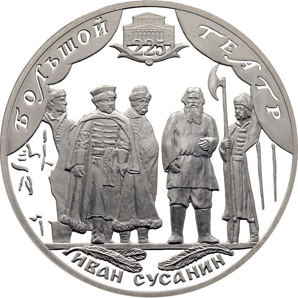 Описание: Сцена з 4-го акту опери «Життя за царя» («Іван Сусанін»), над нею — будівля Большого театру та дата «225», написи вздовж краю: вгорі — «БОЛЬШОЙ ТЕАТР» (БОЛЬШОЙ ТЕАТР), внизу — «ИВАН СУСАНИН» («ІВАН СУСАНІН»).