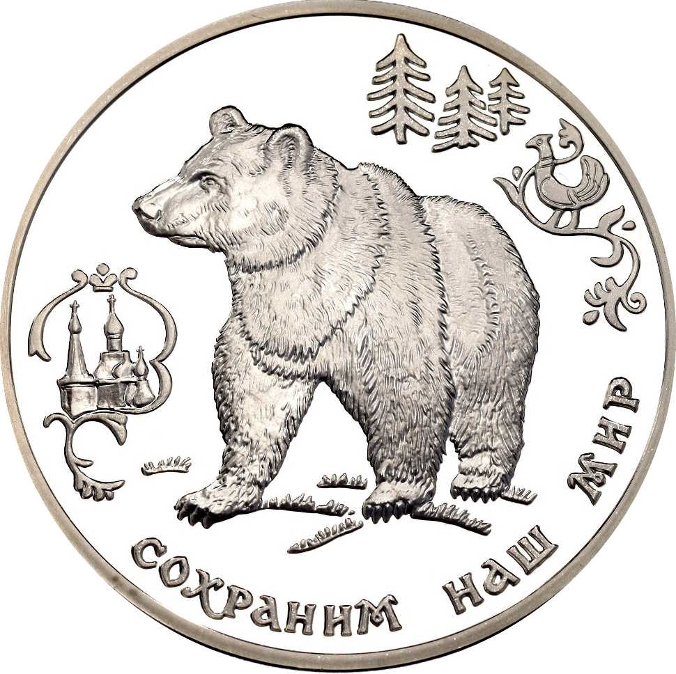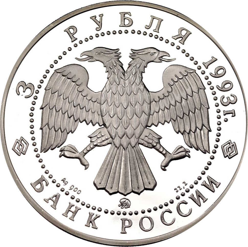 Описание: У центрі — емблема Банку Росії (двоголовий орел, розроблений І. Білібіним), під нею літери, що позначають метал, пробу, знак монетного двору та вміст дорогоцінного металу. Написи по краю, обрамлені колом з крапок: зверху — «3 РУБЛЯ 1993 г.» (3 РУБЛЯ 1993), знизу — «БАНК РОССИИ» (БАНК РОСІЇ).