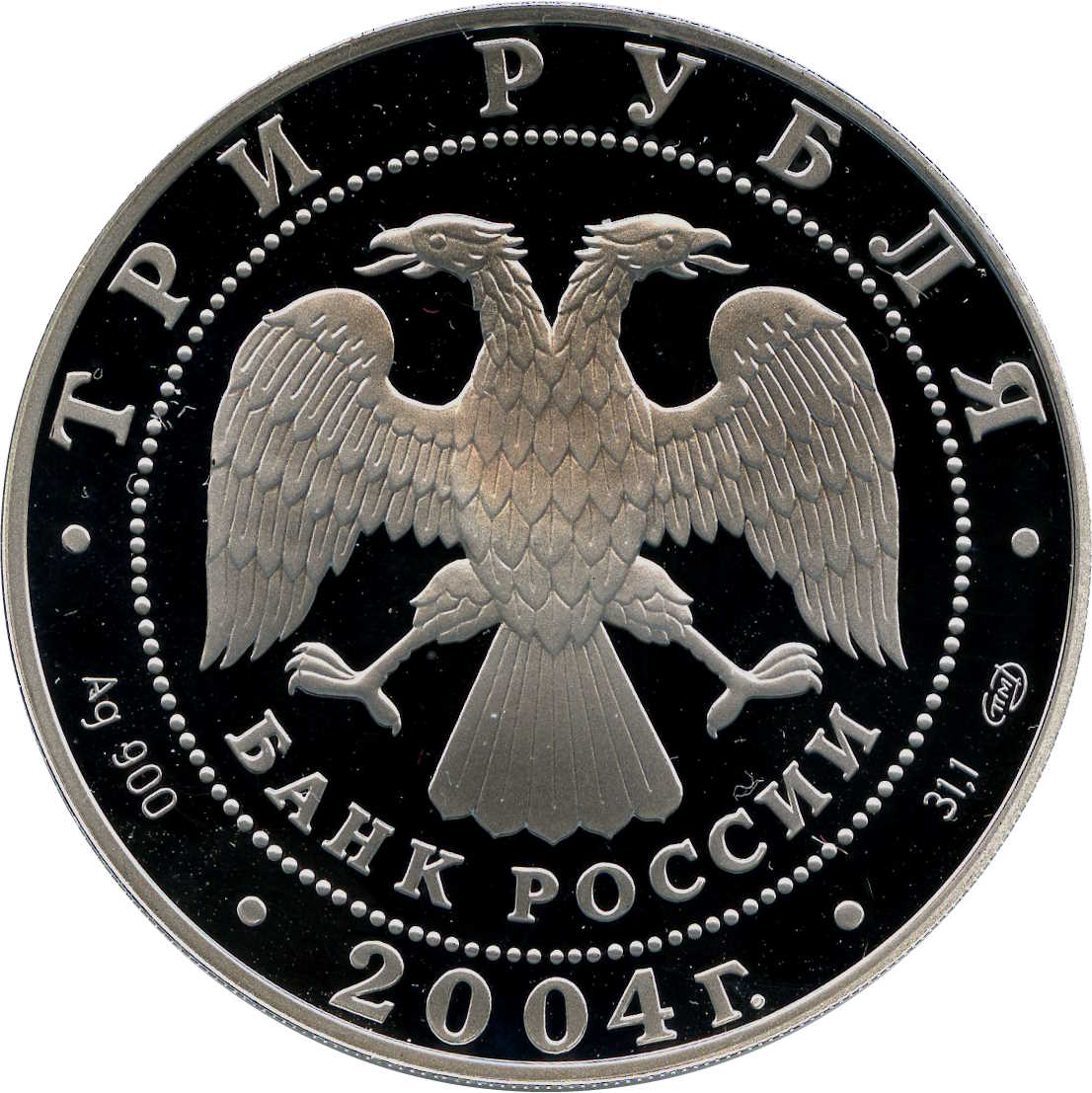 Описание: У центрі — емблема Банку Росії [двоголовий орел із опущеними крилами, нижче — напівкруглий напис — «БАНК РОССИИ» (БАНК РОСІЇ)], обрамлений колом з крапок і написами по краю: вгорі – «ТРИ РУБЛЯ» (ТРИ РУБЛІ), внизу – рік випуску «2004», літери ліворуч позначають метал і пробу, праворуч – вміст дорогоцінного металу і знак монетного двору.