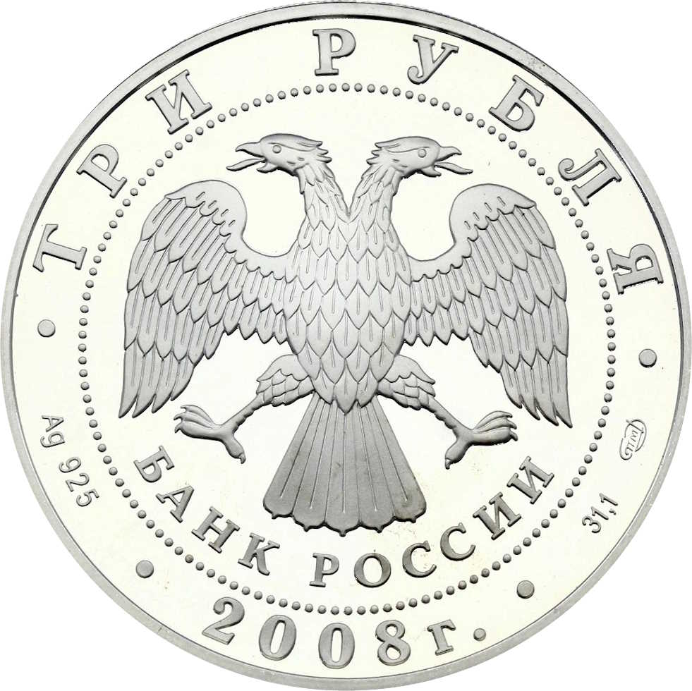 Описание: У центрі — емблема Банку Росії [двоголовий орел із опущеними крилами, під ним — напівкруглий напис «БАНК РОССИИ» (БАНК РОСІЇ)], обрамлена колом з крапок і написів по краю — зверху: «ТРИ РУБЛЯ», нижче: ліворуч - позначення дорогоцінного металу та його проби, у центрі - рік випуску «2008 г.», праворуч - вміст дорогоцінного металу та знак монетного двору.