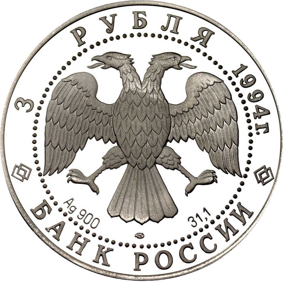 Описание: Двоголовий орел (дизайн І. Білібіна), літери під ним позначають метал, пробу, знак монетного двору та вміст дорогоцінного металу. Написи по краю: зверху — «3 РУБЛЯ 1994 г.» (3 РУБЛЯ 1994), знизу — «БАНК РОССИИ» (БАНК РОСІЇ).