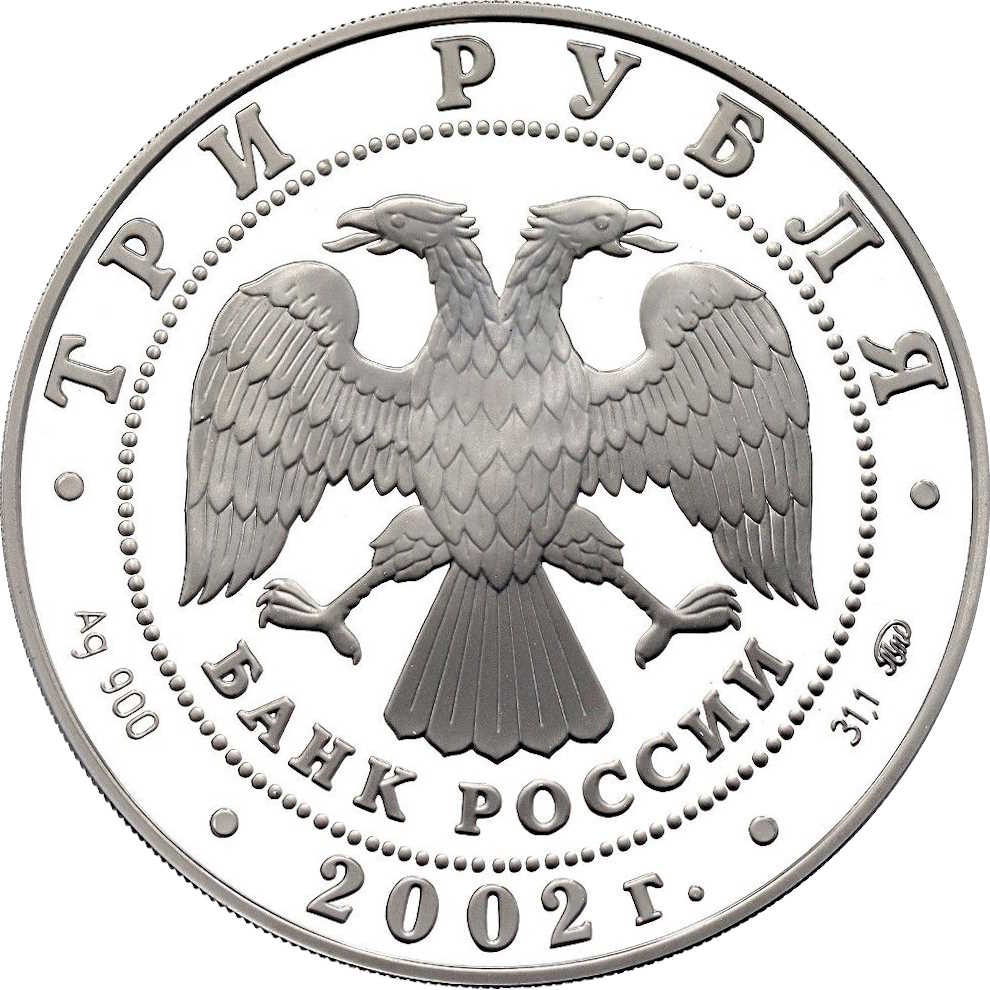 Описание: У центрі — емблема Банку Росії [двоголовий орел із опущеними крилами, нижче — напівкруглий напис «БАНК РОССИИ» (БАНК РОСІЇ)), обрамлена колом з крапок і написів по краю: зверху — «ТРИ РУБЛЯ», внизу — рік випуску «2002», літери ліворуч позначають метал і пробу, праворуч — вміст дорогоцінного металу і знак монетного двору.