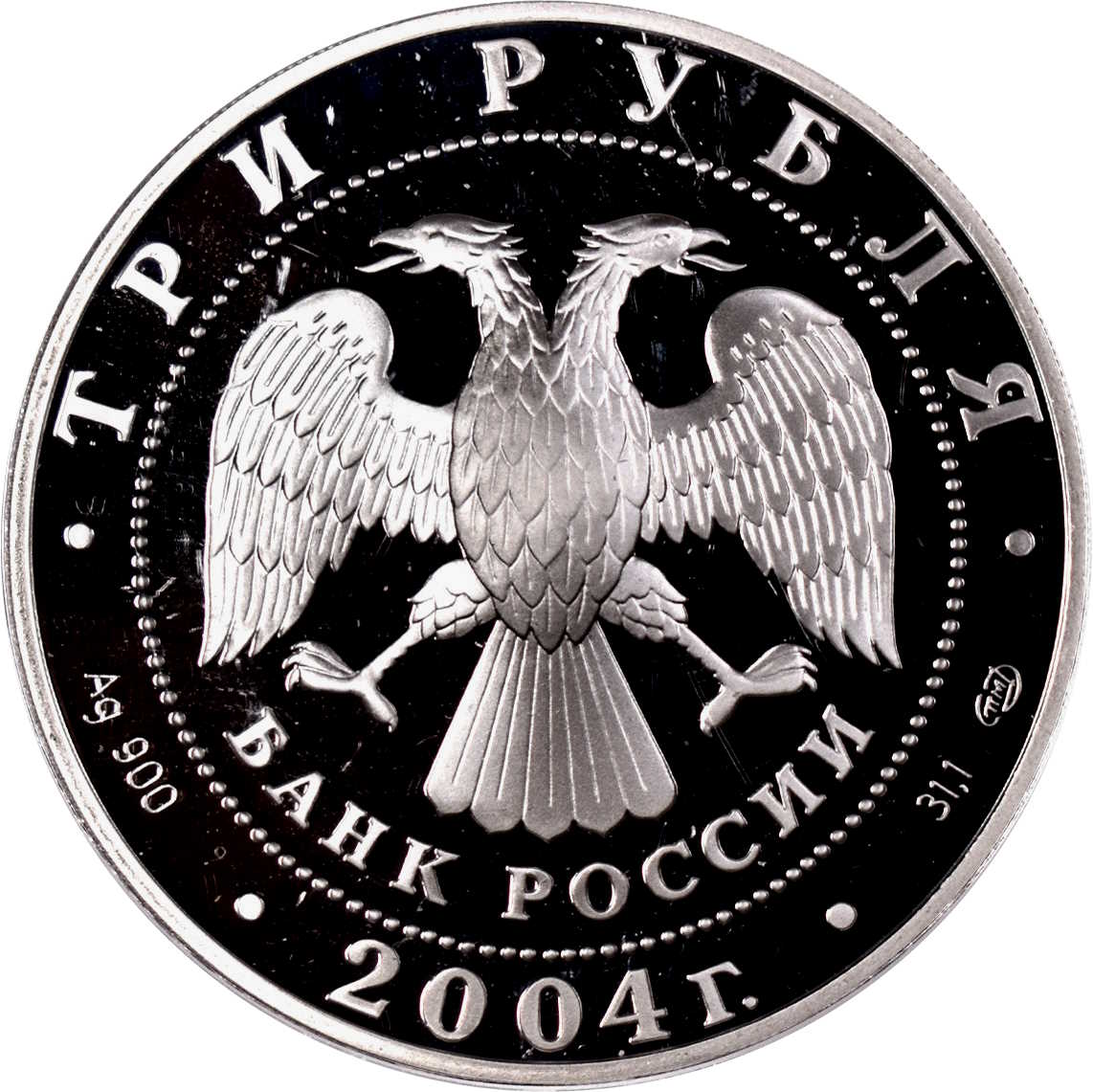 Описание: У центрі — емблема Банку Росії [двоголовий орел із опущеними крилами, нижче — напівкруглий напис — «БАНК РОССИИ» (БАНК РОСІЇ)], обрамлений колом з крапок і написів по краю: вгорі – «ТРИ РУБЛЯ» (ТРИ РУБЛІ), внизу – рік випуску «2004», літери ліворуч позначають метал і пробу, праворуч – вміст дорогоцінного металу і знак монетного двору.