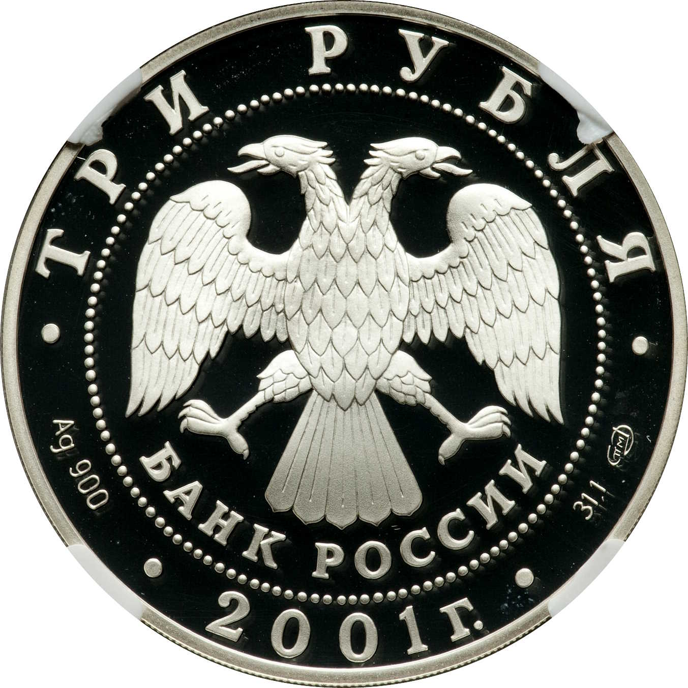 Описание: У центрі — емблема Банку Росії [двоголовий орел зі спущеними крилами, нижче — напівкруглий напис — «БАНК РОССИИ» (БАНК РОСІЇ)], обрамлений колом з крапок і написами по краю: вгорі — «ТРИ РУБЛЯ» (ТРИ РУБЛІ), внизу — рік випуску «2001», літери ліворуч позначають метал і пробу, праворуч — вміст дорогоцінного металу і знак монетного двору.