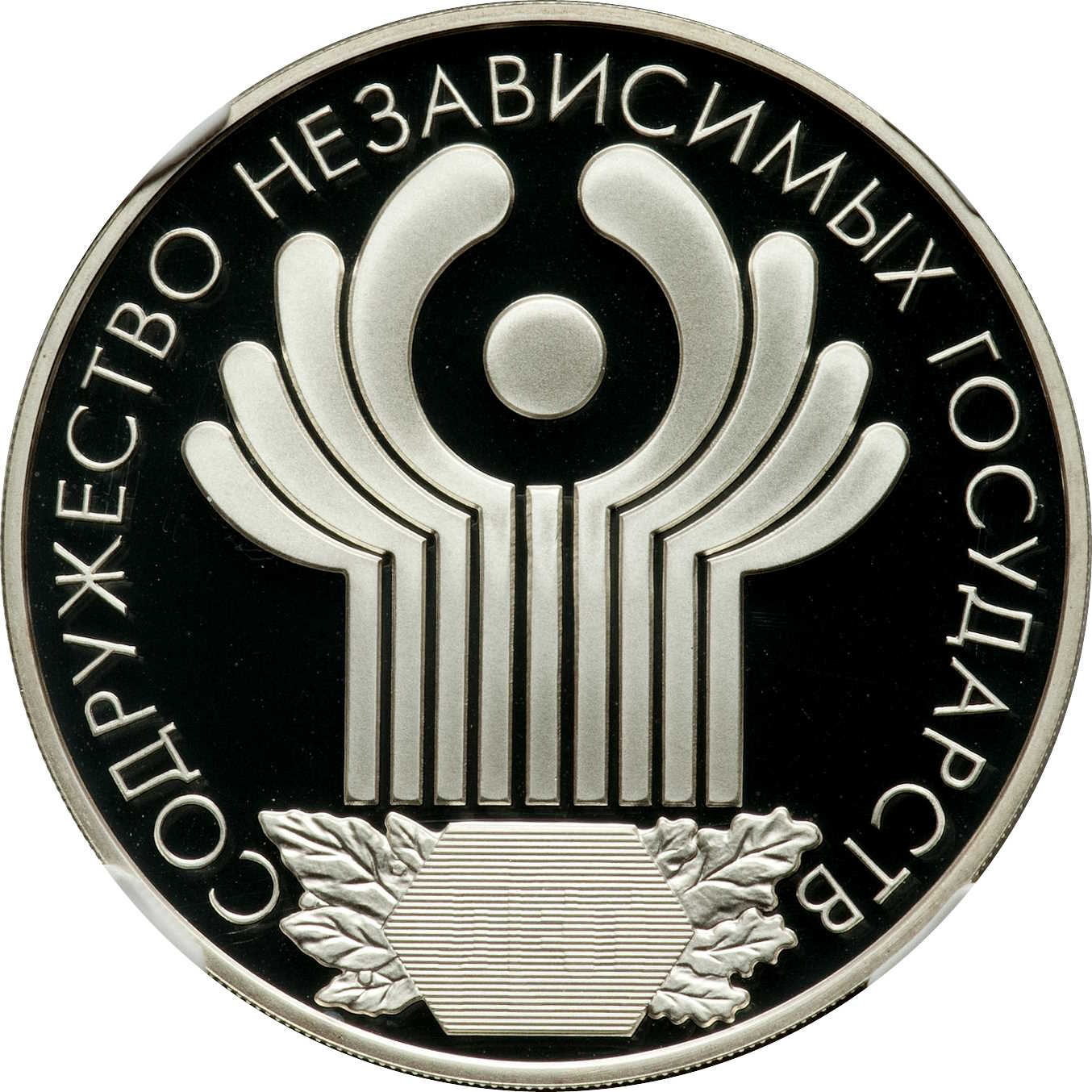 Описание: Зображення емблеми Співдружності Незалежних Держав, внизу — шестикутник, обрамлений листям, на поверхні шестикутника — приховані зображення цифри «10» та слова «ЛЕТ» (РОКИ), написані ліворуч, які видно по черзі лише при зміні кута зору. Напис по краю: «СОДРУЖЕСТВО НЕЗАВИСИМЫХ ГОСУДАРСТВ» (Співдружність Незалежних Держав).
