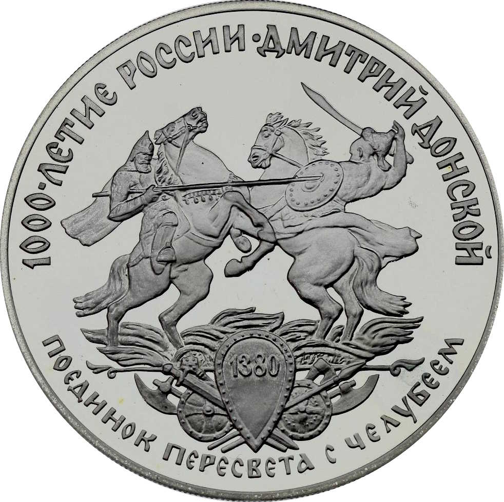 Описание: Реверс: зображення російського та монгольського воїнів Пересвіта та Челубея під час поєдинку, нижче — картуш, складений із зброї та обладунків, на центральному щиті — дата «1380». Написи по краю: вгорі — «1000-ЛЕТИЕ РОССИИ — ДМИТРИЙ ДОНСКОЙ» (Тисячоліття Росії — Дмитро Донський), внизу — «ПОЕДИНОК ПЕРЕСВЕТА С ЧЕЛУБЕЕМ» (Поєдинок Пересвета з Челубеєм).