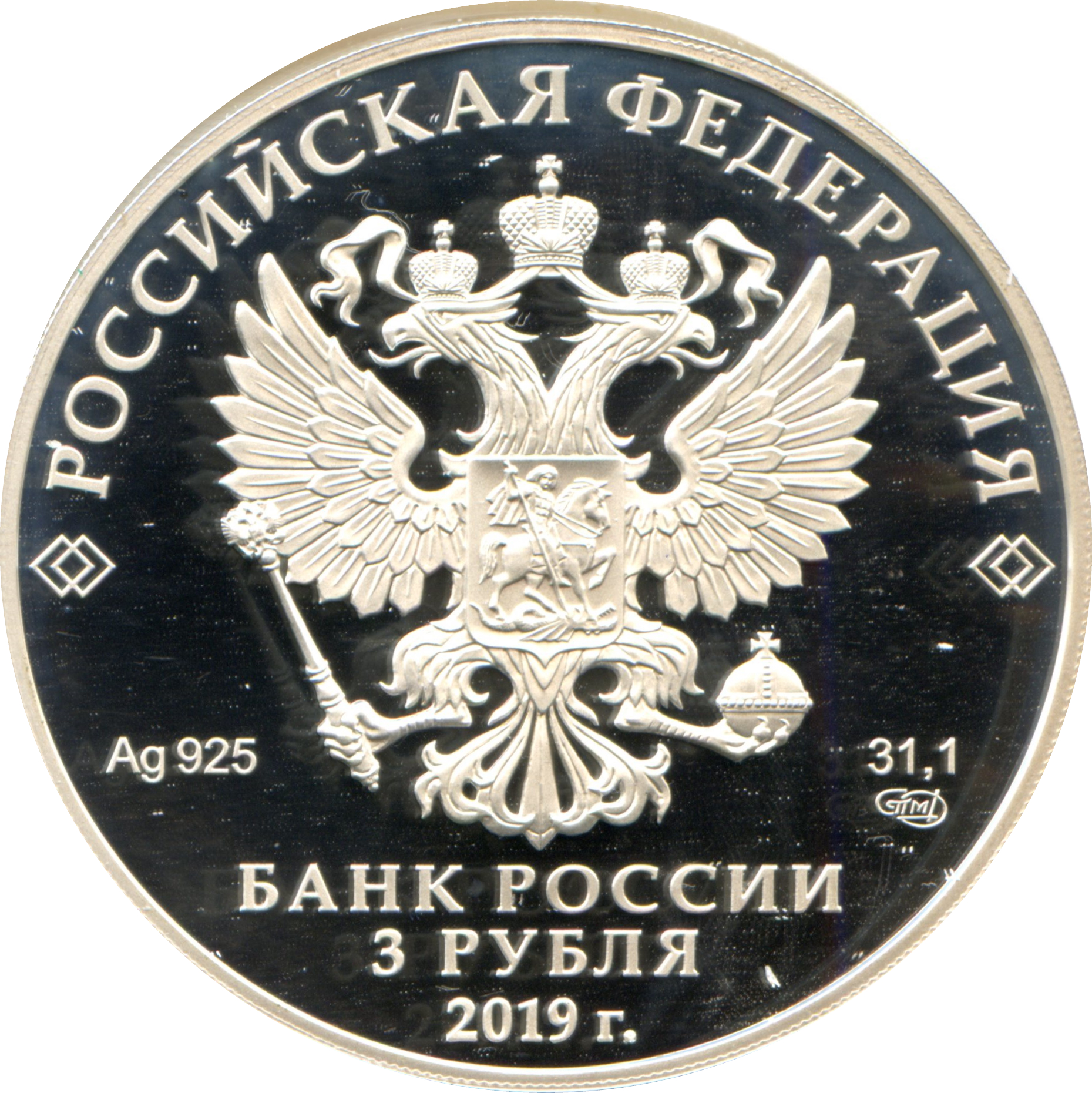 Описание: На дзеркальному полі диска – рельєфне зображення Державного герба Російської Федерації, над ним – напівкругла напис по колу: «РОССИЙСКАЯ ФЕДЕРАЦИЯ» (РОСІЙСЬКА ФЕДЕРАЦІЯ), обрамлене з обох боків подвійними ромбами, нижче під гербом: ліворуч – позначення дорогоцінного металу та його проби, праворуч – вміст дорогоцінного металу та торговельна марка монетного двору, внизу по центру, у три рядки – напис: «БАНК РОССИИ» (БАНК РОСІЇ), номінал монети: «3 РУБЛЯ» (3 РУБЛІ), рік.