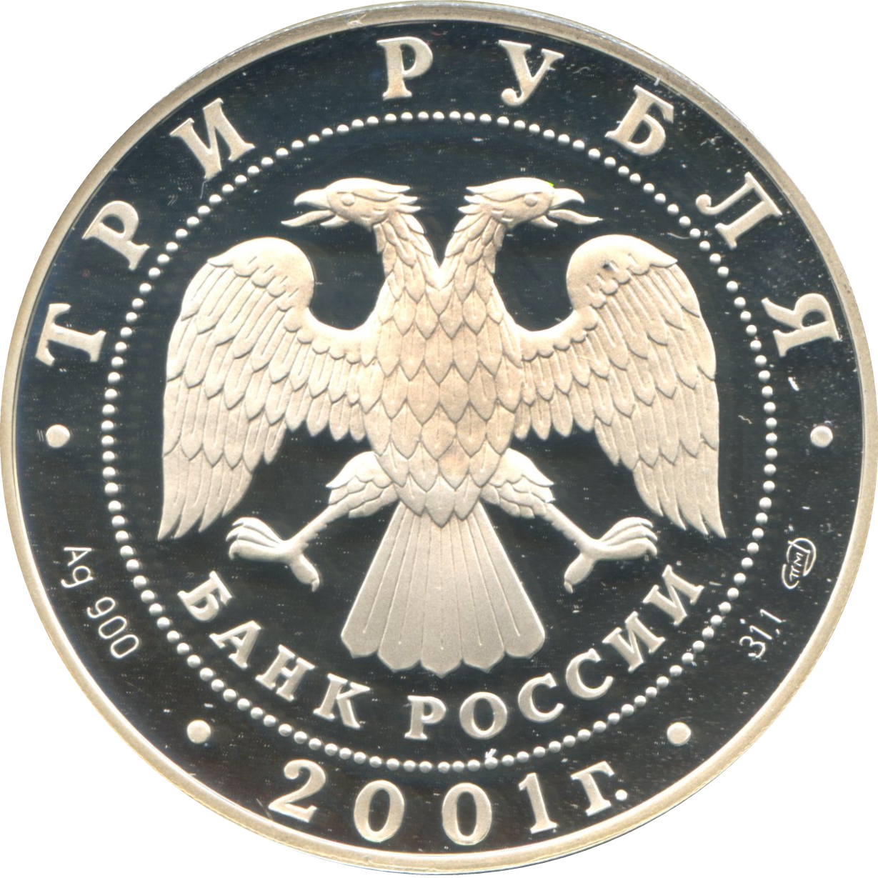 Описание: У центрі — емблема Банку Росії [двоголовий орел із опущеними крилами, нижче — напівкруглий напис — «БАНК РОССИИ» (БАНК РОСІЇ)], обрамлений колом з крапок і написами по краю: вгорі — «ТРИ РУБЛЯ» (ТРИ РУБЛІ), внизу — рік випуску «2001», літери ліворуч позначають метал і пробу, праворуч — вміст дорогоцінного металу і знак монетного двору.