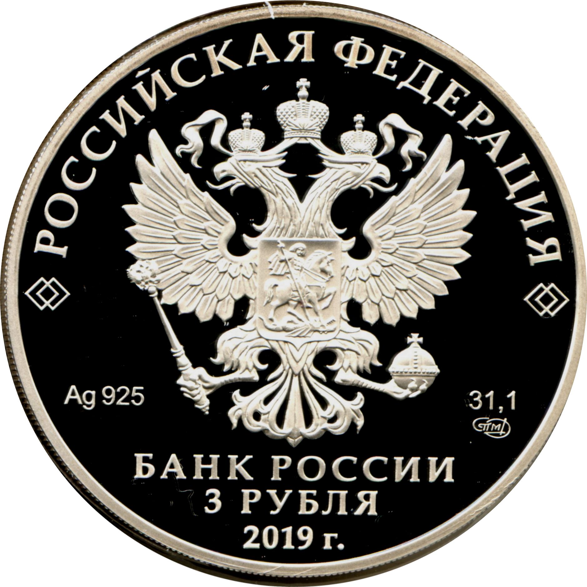 Описание: На аверсі монети зображено рельєфний герб Російської Федерації та написи «РОССИЙСКАЯ ФЕДЕРАЦИЯ» (РОСІЙСЬКА ФЕДЕРАЦІЯ) і «БАНК РОССИИ» (БАНК РОСІЇ), номінал монети «3 РУБЛЯ» (3 РУБЛЯ), рік випуску «2019 г.» (2019), хімічний символ металу згідно з періодичною таблицею Менделєєва, проба, торговельна марка Санкт-Петербурзького монетного двору та вміст дорогоцінного металу.