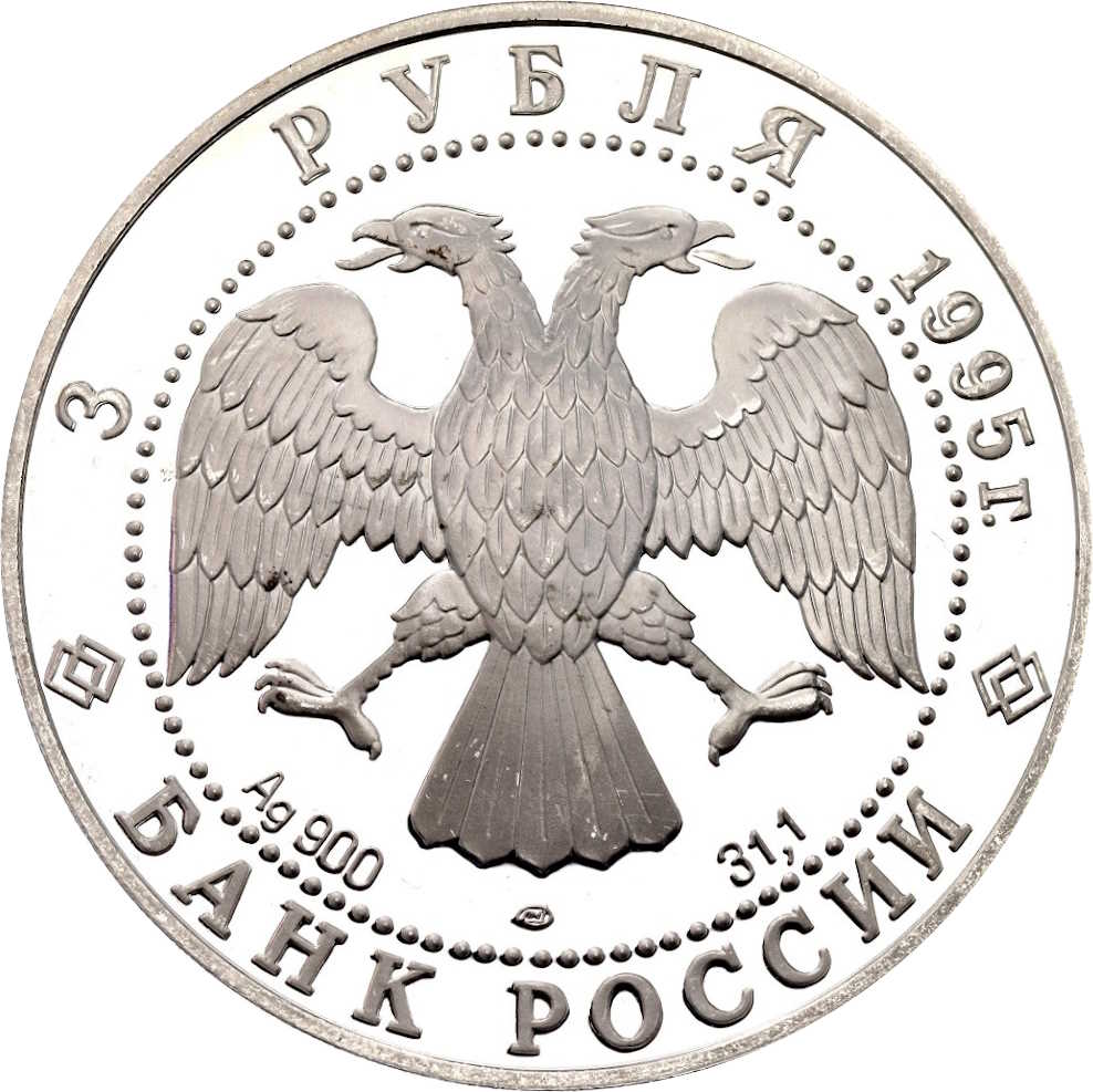 Описание: У центрі — емблема Банку Росії (двоголовий орел, створений І. Білібіним), під нею літери, що позначають метал, пробу, знак монетного двору та вміст дорогоцінного металу. Написи по краю, обрамлені колом з крапок: зверху — «3 РУБЛЯ 1995 г.» (3 РУБЛЯ 1995), знизу — «БАНК РОССИИ» (БАНК РОСІЇ).