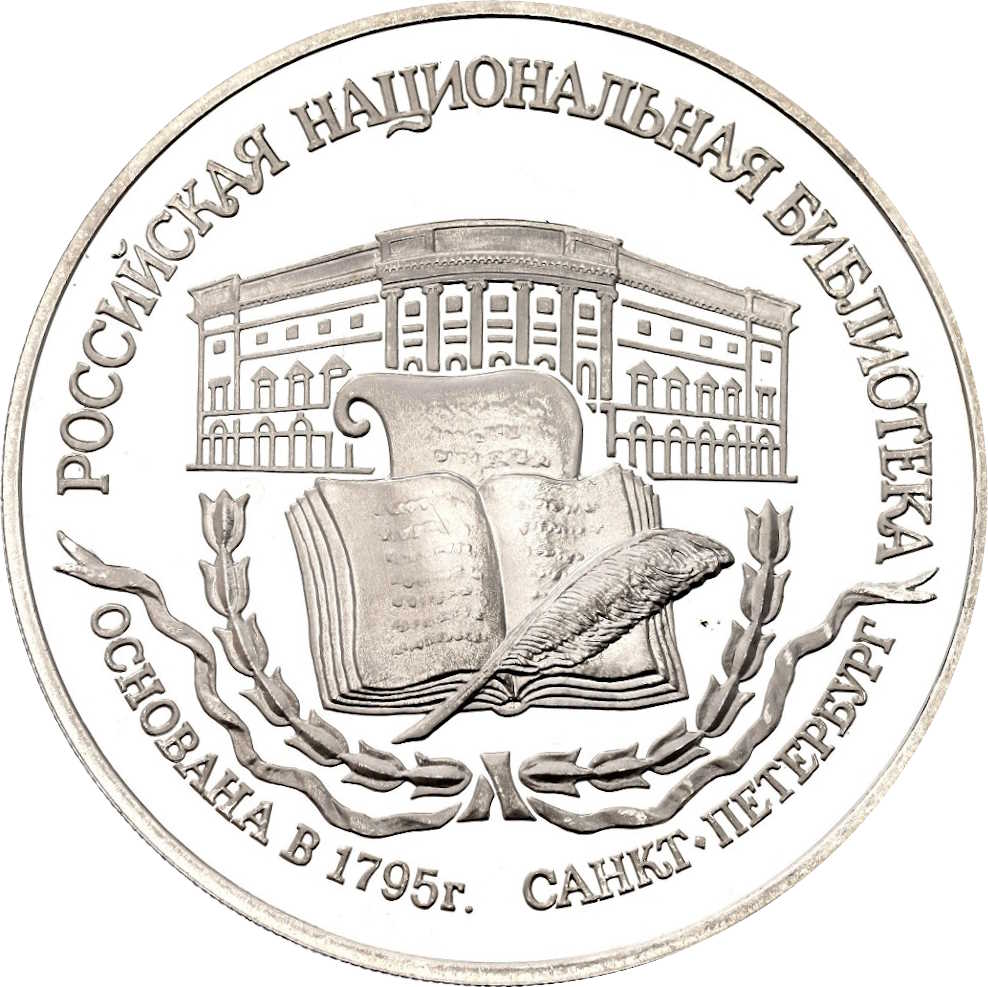 Описание: Вид будівлі Російської національної бібліотеки та сувій, книга, гусяче перо та гірлянда з листя з стрічками, написи по краю: вгорі — «РОССИЙСКАЯ НАЦИОНАЛЬНАЯ БИБЛИОТЕКА» (РОСІЙСЬКА НАЦІОНАЛЬНА БІБЛІОТЕКА), внизу — «ОСНОВАНА В 1795 г. САНКТ-ПЕТЕРБУРГ» (ЗАСНОВАНА В 1795 Р. САНКТ-ПЕТЕРБУРГ).