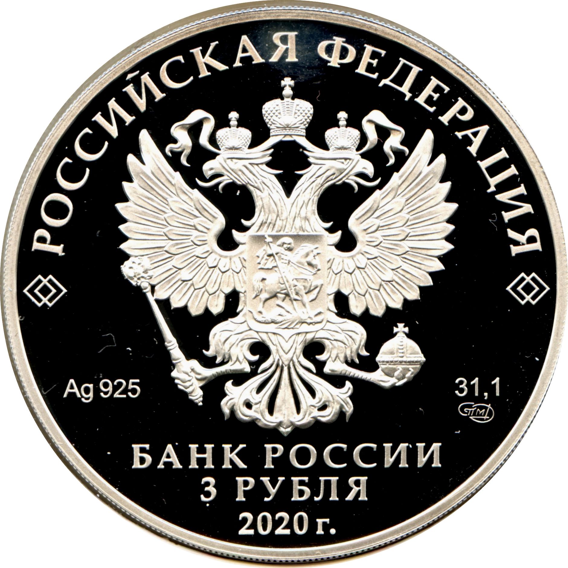 Описание: На дзеркальному полі диска зображено рельєфний герб Російської Федерації, над ним по колу розміщено напівкруглий напис «РОССИЙСКАЯ ФЕДЕРАЦИЯ» (РОСІЙСЬКА ФЕДЕРАЦІЯ), обрамлене з обох боків подвійними ромбами, нижче під гербом зліва вказано дорогоцінний метал і його пробу, а праворуч — вміст дорогоцінного металу і знак монетного двору, внизу по центру трьома рядками розміщено напис «БАНК РОССИИ» (БАНК РОСІЇ), номінал монети «3 РУБЛЯ» (3 РУБЛІ) і рік випуску «2020 г.» (2020).