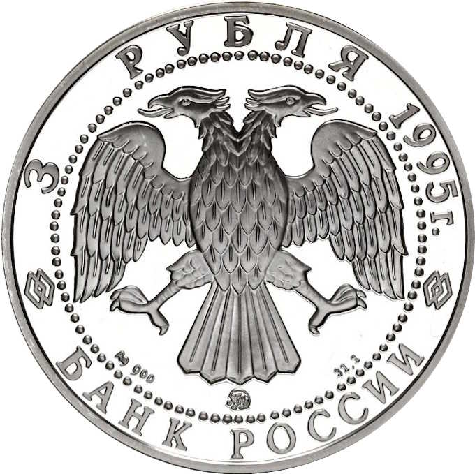 Описание: У центрі — емблема Банку Росії (двоголовий орел, розроблений І. Білібіним), під нею літери, що позначають метал, пробу, знак монетного двору та вміст дорогоцінного металу. Написи по краю, обрамлені колом з крапок: у верхній частині — «3 РУБЛЯ 1995 г.» (3 РУБЛЯ 1995), у нижній частині — «БАНК РОССИИ» (БАНК РОСІЇ).