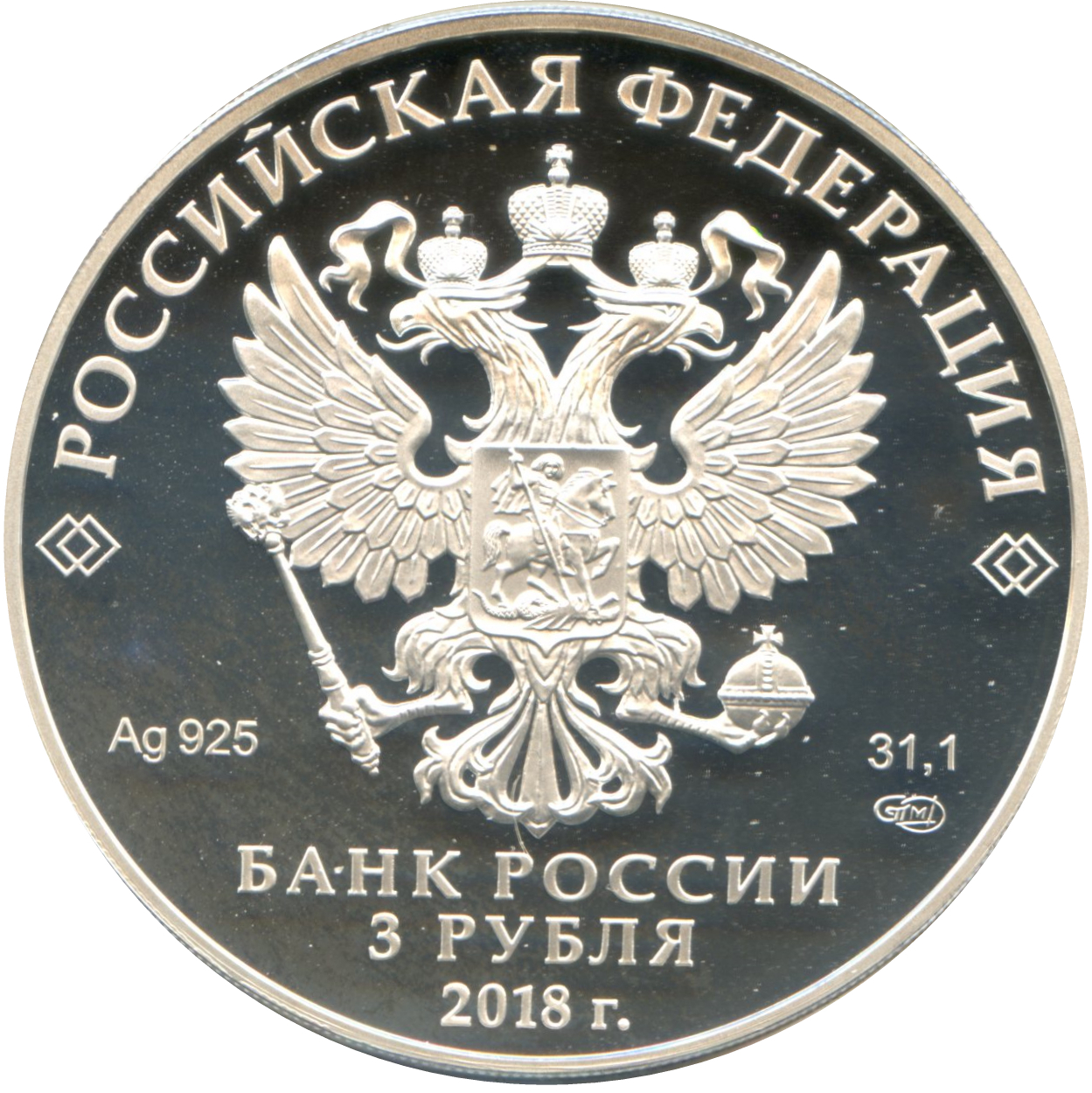 Описание: На дзеркальному полі диска – рельєфне зображення Державного герба Російської Федерації, над ним – напівкругла напис по колу: «РОССИЙСКАЯ ФЕДЕРАЦИЯ» (РОСІЙСЬКА ФЕДЕРАЦІЯ), обрамлений з обох боків подвійними ромбами, нижче під гербом: ліворуч – позначення дорогоцінного металу та його проби, праворуч – вміст дорогоцінного металу та знак монетного двору, внизу по центру, у три рядки – напис: «БАНК РОССИИ» (БАНК РОСІЇ), номінал монети: «3 РУБЛЯ» (3 РУБЛІ), рік.