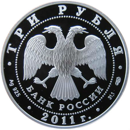 Описание: У центрі — емблема Банку Росії [двоголовий орел із розпростертими крилами, під ним — напівкруглий напис «БАНК РОССИИ» (БАНК РОСІЇ)], обрамлена колом з крапок і написів по краю — зверху: «ТРИ РУБЛЯ», нижче: ліворуч - позначення дорогоцінного металу та його проби, в центрі - рік випуску «2011 г.», праворуч - вміст дорогоцінного металу та знак монетного двору.