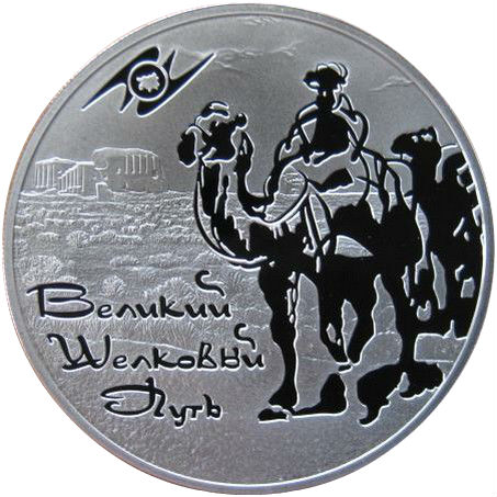 Описание: На матовому диску монети — рельєфне зображення пустелі, на задньому плані ліворуч — руїни будівель, на передньому плані праворуч — фігура верблюда, що йде з вершником, намальована контурними лініями та дзеркальними ділянками поля монети, голова та передня частина тіла іншого верблюда, крізь фігуру першого верблюда видно будівлю мечеті, зображену на задньому плані; у лівій частині диска внизу – напис у три рядки, стилізований під курсив: «ВЕЛИКИЙ ШЕЛКОВЫЙ ПУТЬ» (ВЕЛИКИЙ ШОВКОВИЙ ШЛЯХ), ліворуч вгорі по колу – емблема Євразійського економічного співтовариства.