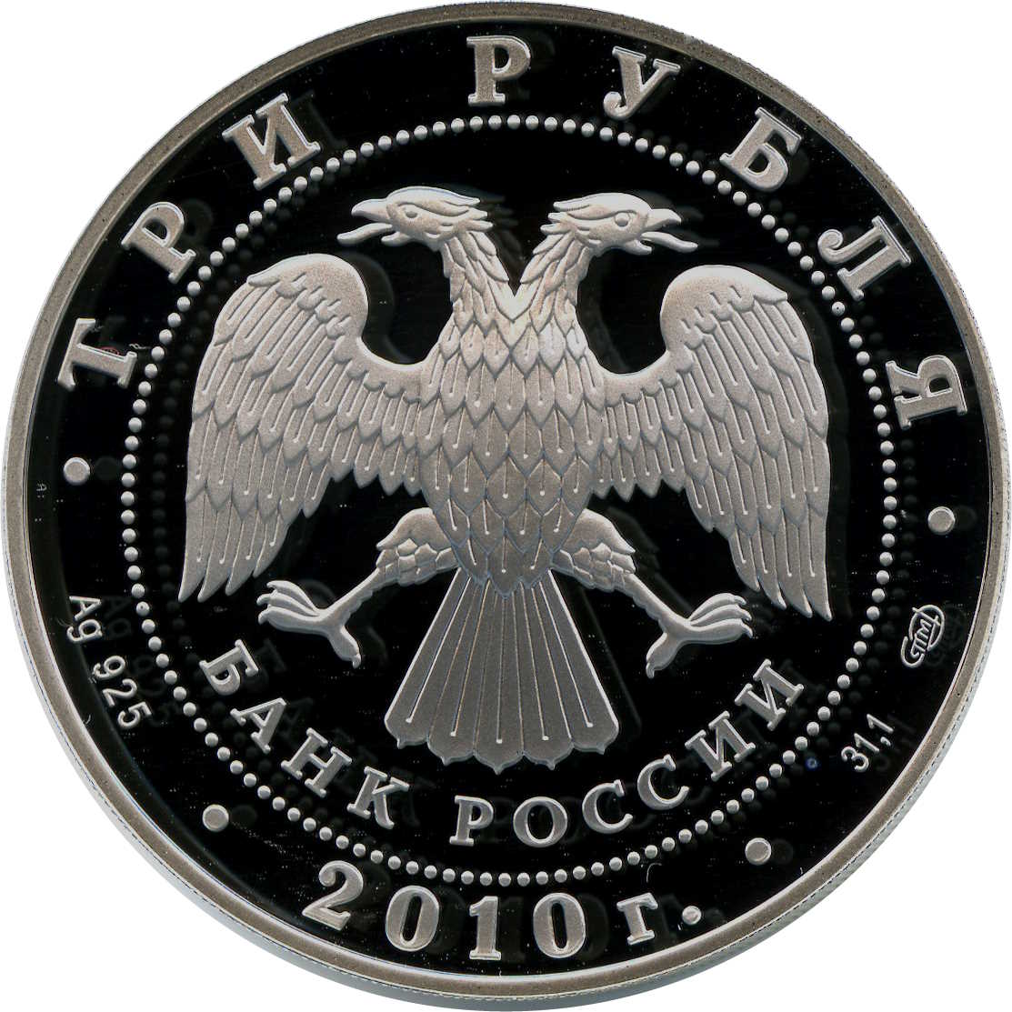 Описание: У центрі — емблема Банку Росії [двоголовий орел із розпростертими крилами, під ним — напівкруглий напис «БАНК РОССИИ» (БАНК РОСІЇ)], обрамлена колом з крапок і написів по краю — зверху: «ТРИ РУБЛЯ», нижче: ліворуч - позначення дорогоцінного металу та його проби, у центрі - рік випуску «2010 г.», праворуч - вміст дорогоцінного металу та знак монетного двору.