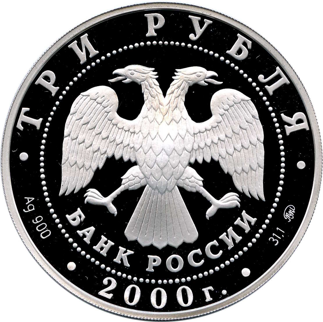 Описание: У центрі — емблема Банку Росії (двоголовий орел, створений І. Білібіним), нижче — напівкругла напис — «БАНК РОССИИ» (БАНК РОСІЇ), обрамлена колом з крапок і написів по краю: вгорі — «ТРИ РУБЛЯ» (ТРИ РУБЛІ), внизу — дата «2000», літери ліворуч позначають метал і пробу, праворуч — вміст дорогоцінного металу і знак монетного двору.