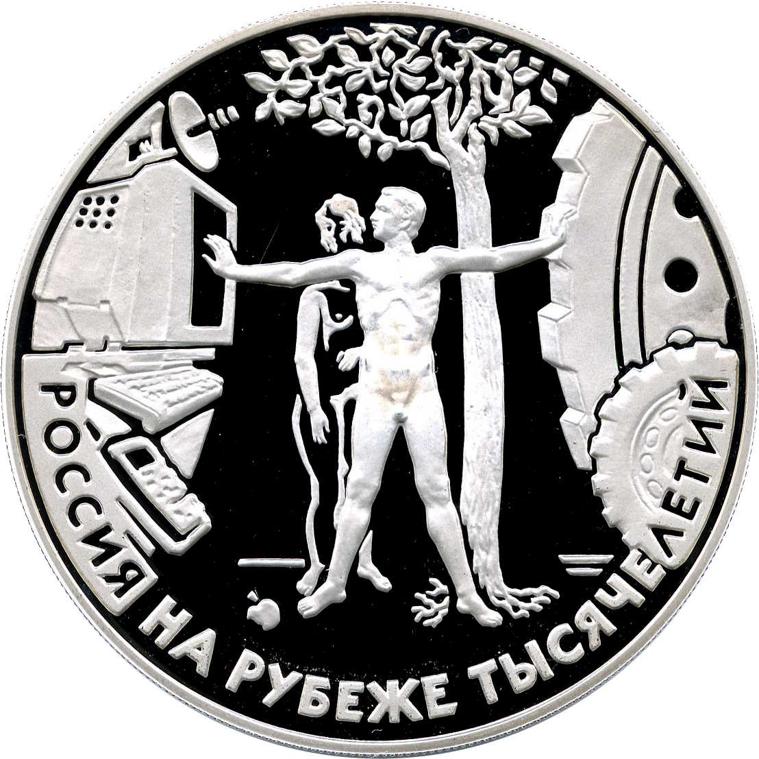 Описание: Зображення чоловіка, жінки та дерева як уособлення перших людей та первісної природи Землі, по обидва боки — атрибути сучасної цивілізації, що наближається до них: ліворуч — засоби комунікації (супутникова антена, монітор комп'ютера, мобільний телефон), праворуч — механізми (шестерні). Напис внизу по краю - «РОССИЯ НА РУБЕЖЕ ТЫСЯЧЕЛЕТИЙ» (РОСІЯ НА ПОРОЗІ ТИСЯЧОЛІТТЯ).