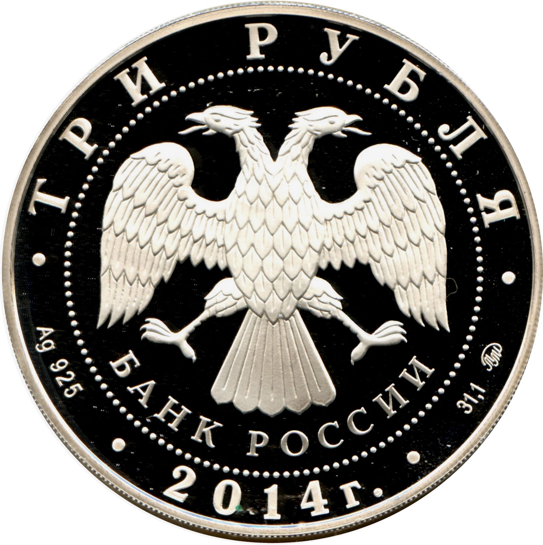 Описание: У центрі — емблема Банку Росії [двоголовий орел із опущеними крилами, під ним — напівкруглий напис «БАНК РОССИИ» (БАНК РОСІЇ)], обрамлена колом з крапок і написів по краю — зверху: «ТРИ РУБЛЯ», нижче: ліворуч – позначення дорогоцінного металу та його проби, у центрі – рік випуску «2014 г.», праворуч – вміст дорогоцінного металу та знак монетного двору.
