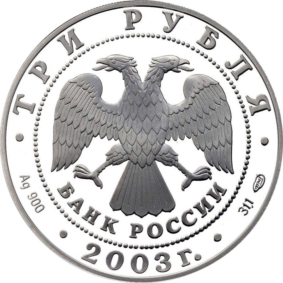 Описание: У центрі — емблема Банку Росії [двоголовий орел із опущеними крилами, нижче — напівкругла напис — «БАНК РОССИИ» (БАНК РОСІЇ)] в обрамленні кола з крапок і написів по краю: зверху — «ТРИ РУБЛЯ», внизу — рік випуску «2003», літери ліворуч позначають метал і пробу, праворуч — вміст дорогоцінного металу і знак монетного двору.
